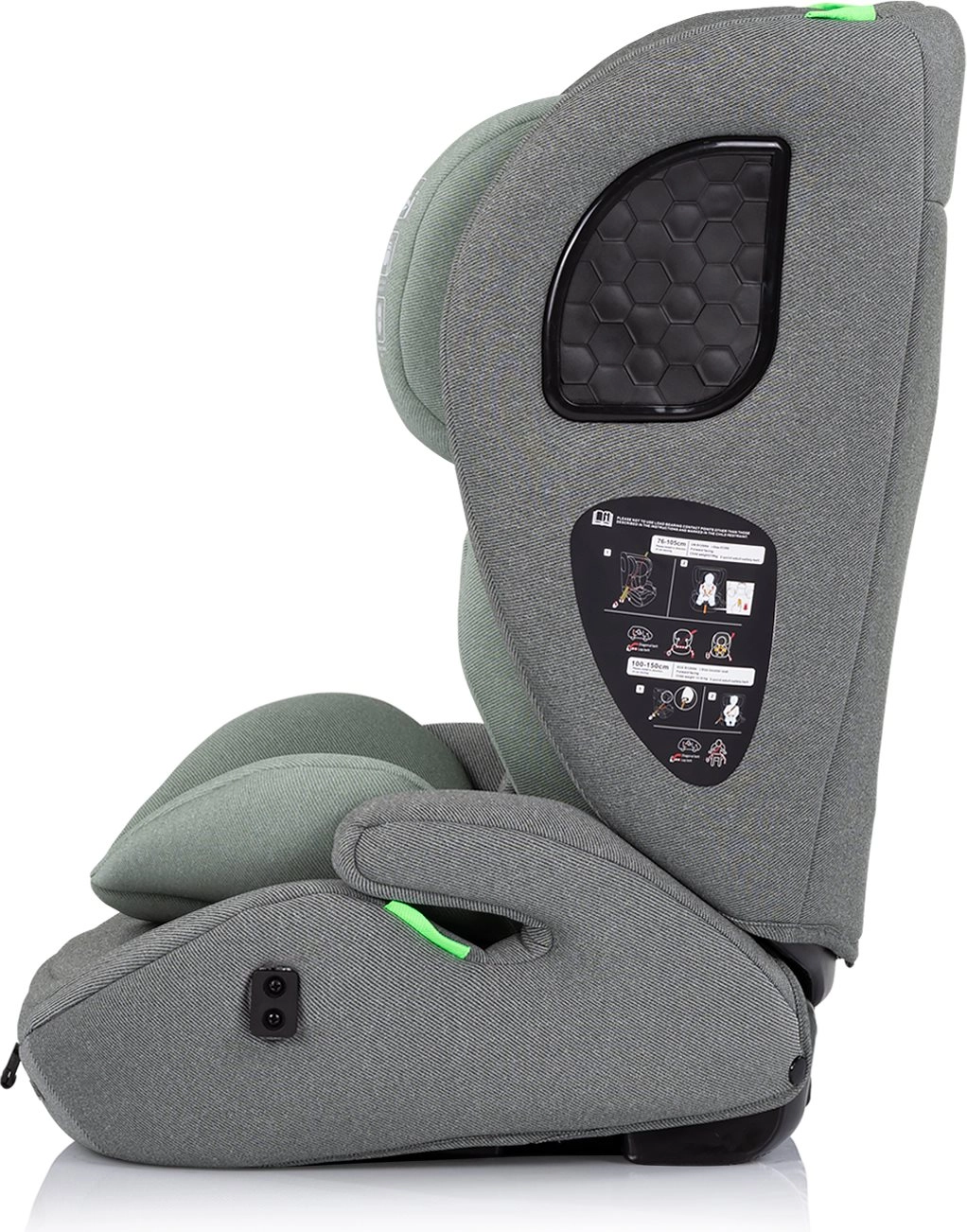 Sjedalica ispunjava najnoviji i-Size standard uključujući testove frontalnog, stražnjeg i bočnog sudara. Odabir prema visini osigurava ispravno smještanje djeteta.
