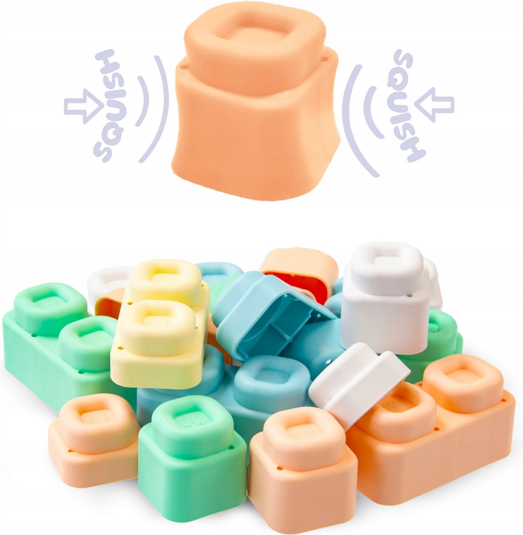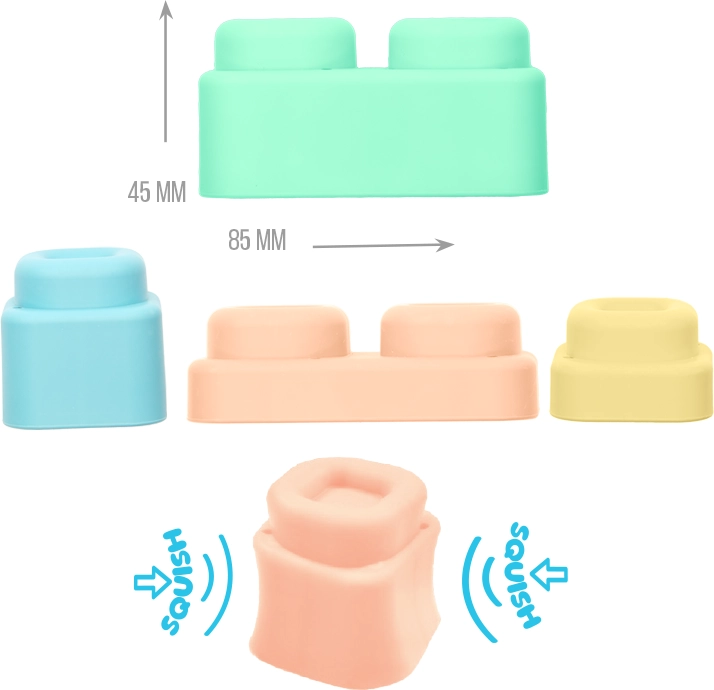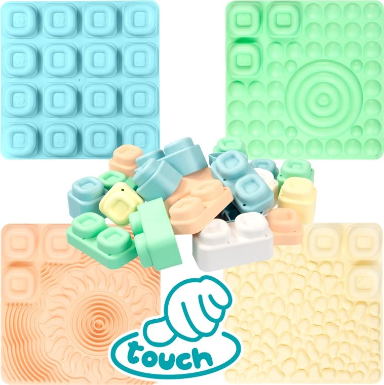 Set MOCHTOYS Play & Squish donosi sigurno i poticajno okruženje za otkrivanje tekstura, oblika i boja. Svaka podloga ima drugačiju teksturu koja potiče osjet dodira, dok su meke i elastične kocke lako prihvatljive i najmanjim rukama te pozivaju na slaganje, razvrstavanje i slobodnu igru.