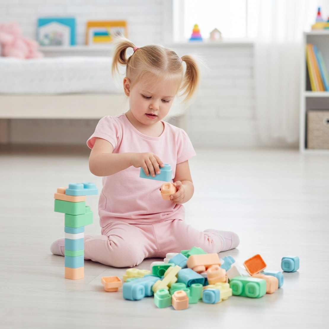 Materijal je mekan, elastičan i certificiran, tako da djeca mogu kocke i podloge sigurno stiskati, grickati ili bacati bez rizika od ozljede. Dijelovi se mogu lako spajati i razdvajati, što jača finu motoriku, koordinaciju oko–ruka i samostalnost u igri.