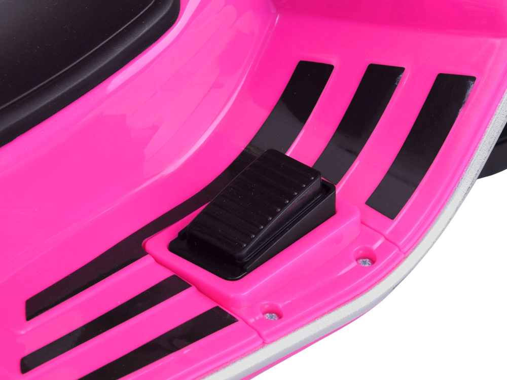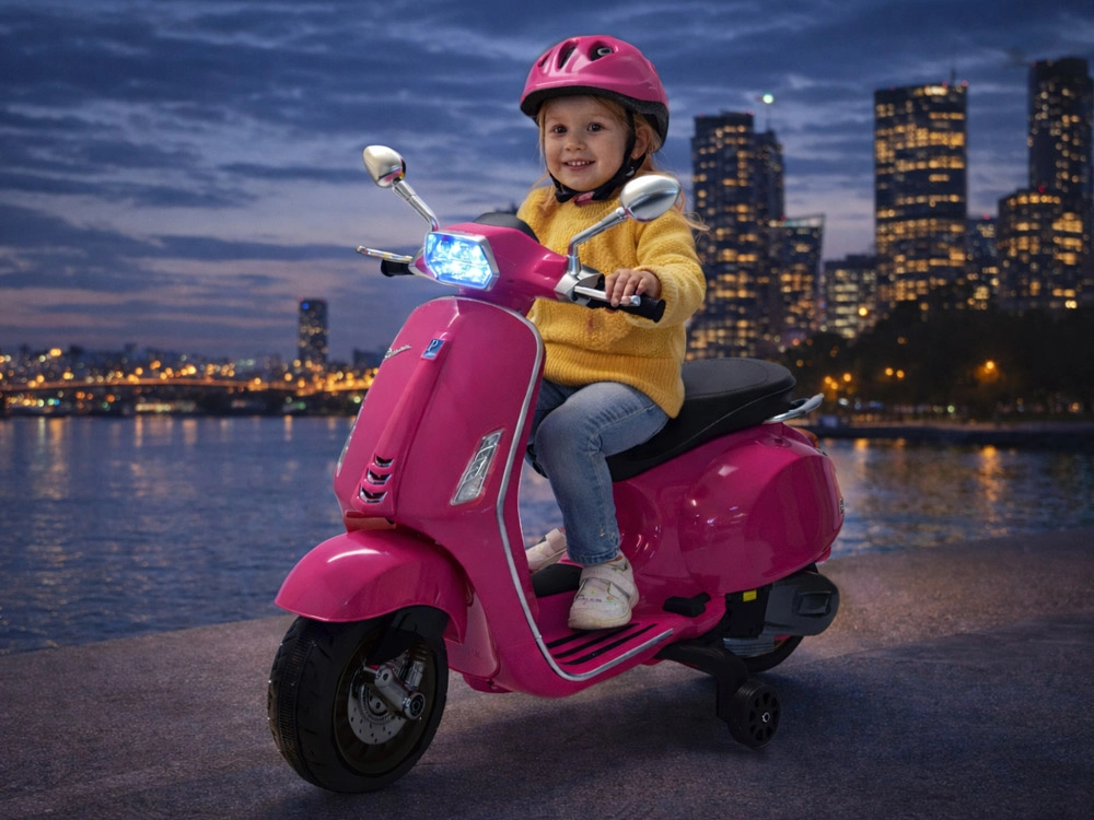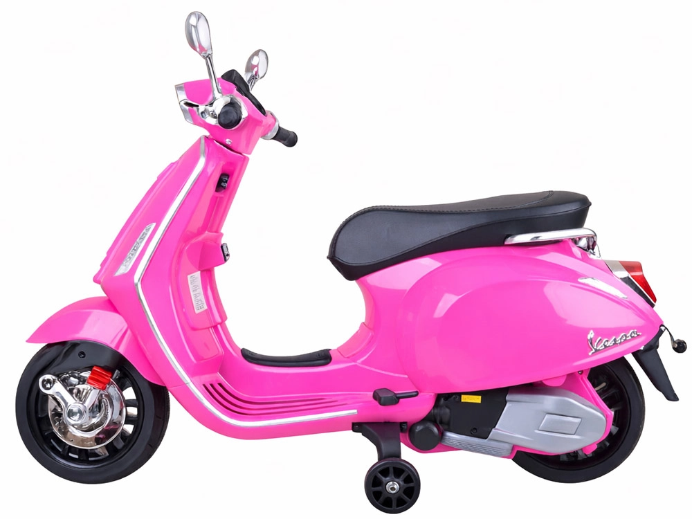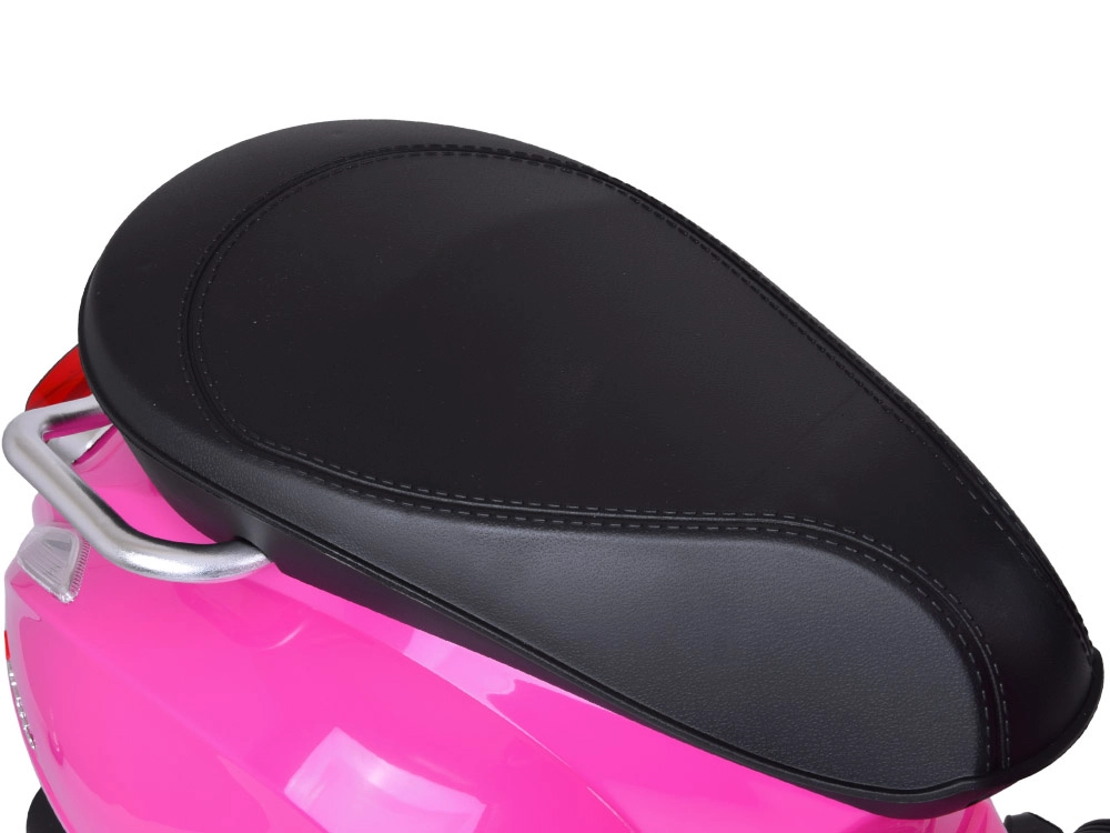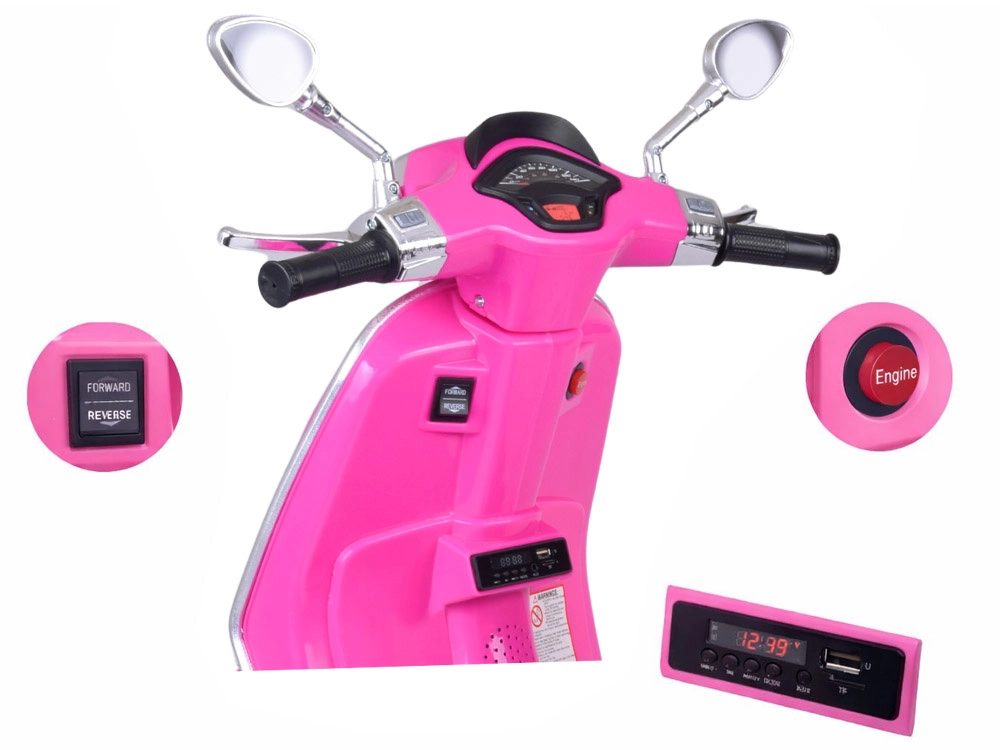 Električni dječji skuter u stilu VESPE spaja elegantan dizajn s modernim funkcijama. Pokreće se pritiskom na gumb, a simulacija zvuka motora pruža autentičan doživljaj vožnje. Snažan pogon 2 × 12 V / 25 W i akumulator 12 V / 4,5 Ah osiguravaju udobnu i glatku vožnju, dok prednji svjetlomet dodaje stil i bolju vidljivost.