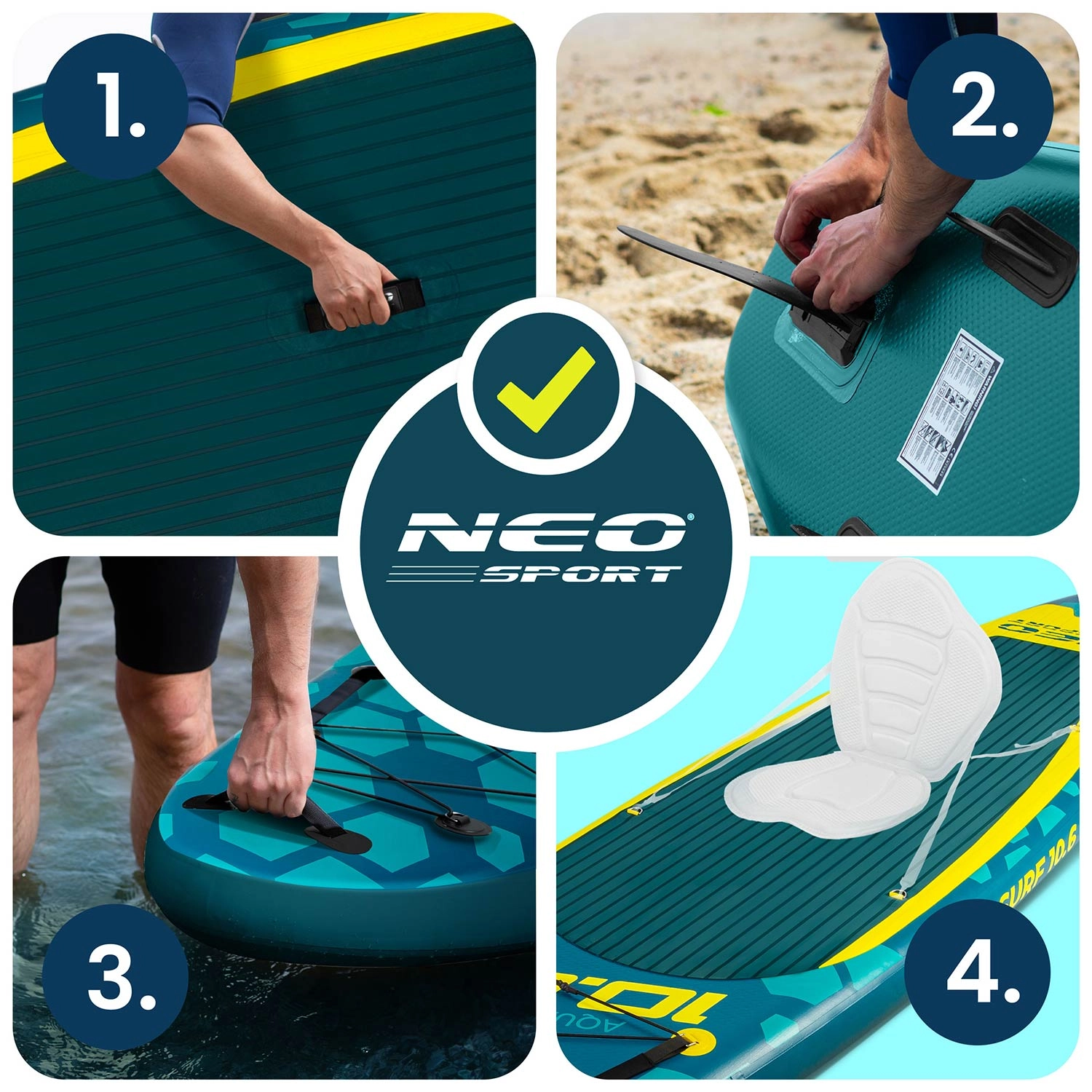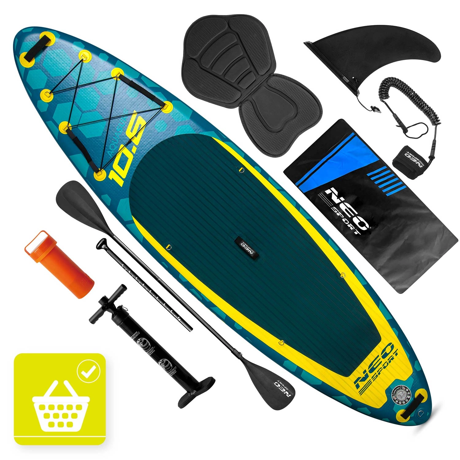 Dio pakiranja je dvoradna pumpa s manometrom za brzo i sigurno napuhavanje, podesivo aluminijsko veslo (162–210 cm) s brzom aretacijom, sigurnosni leash s okretnim zglobom protiv zaplitanja, odvojiva središnja peraja, set za popravak i izdržljiv transportni ruksak s ojačanim materijalom. Zahvaljujući nosivosti do 140 kg, SUP je pogodan za vozače različite visine i građe te za lagani teret.