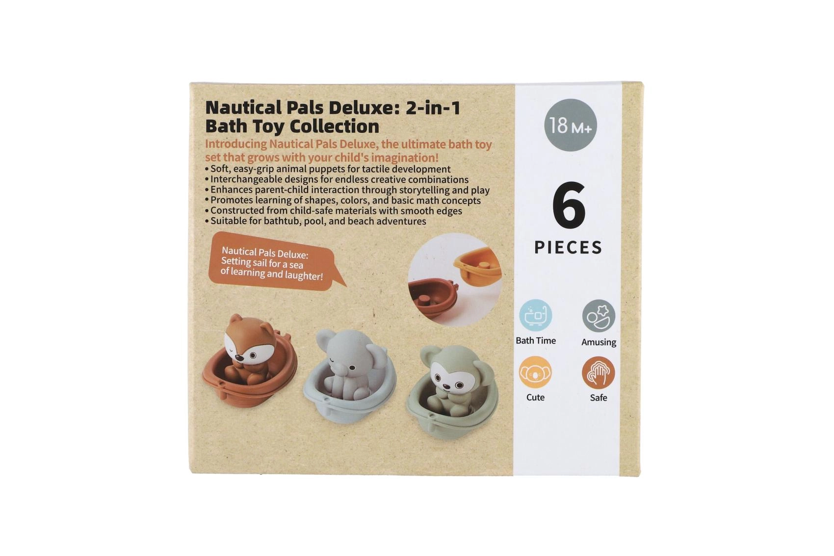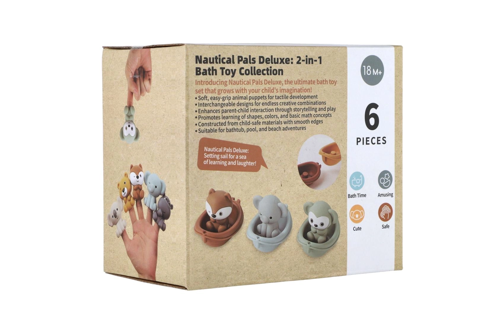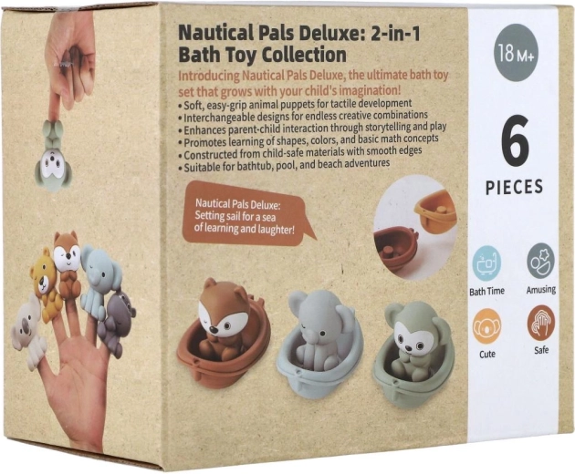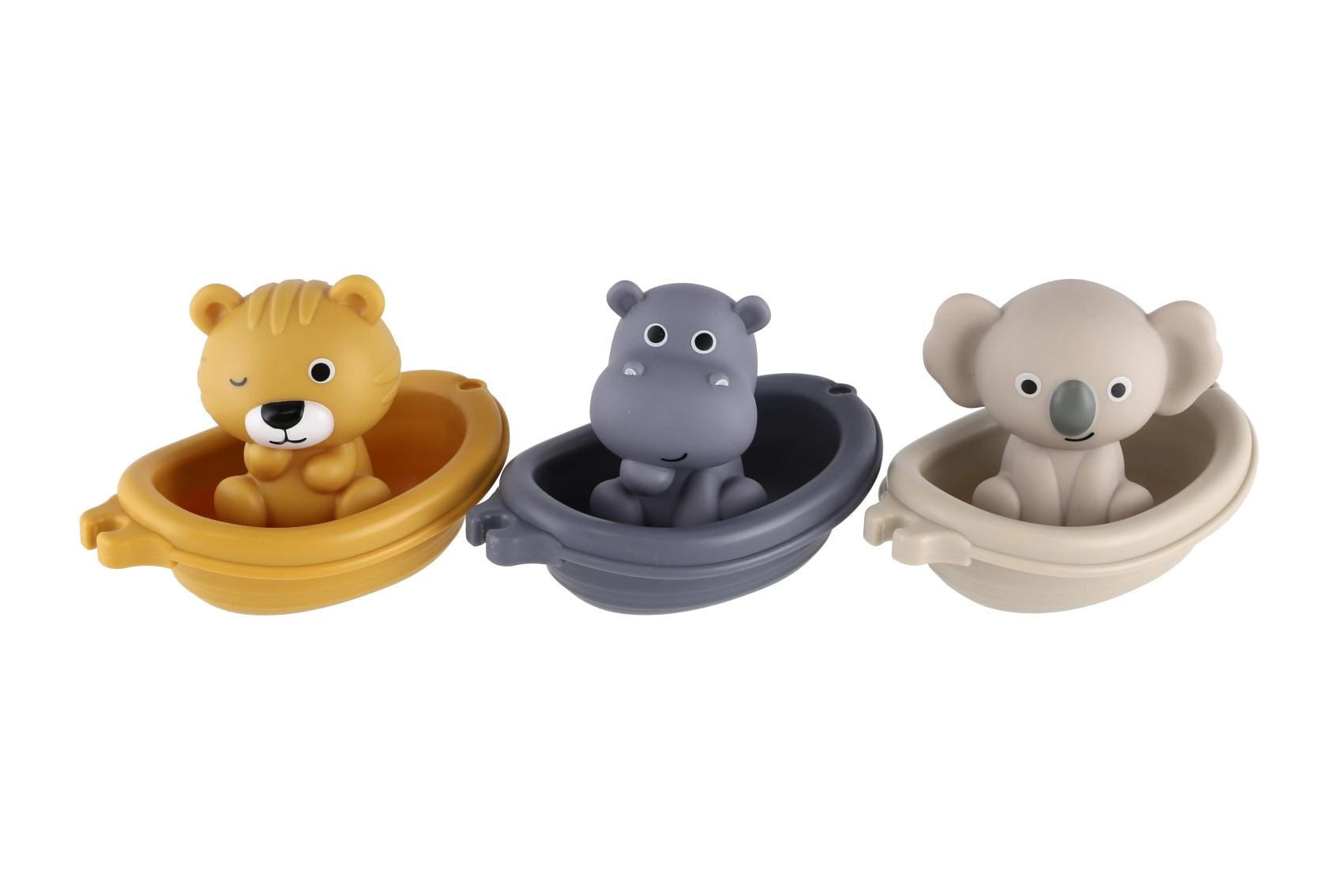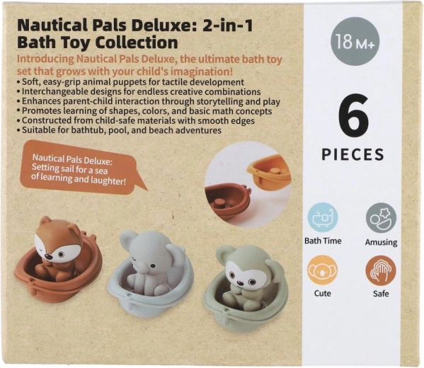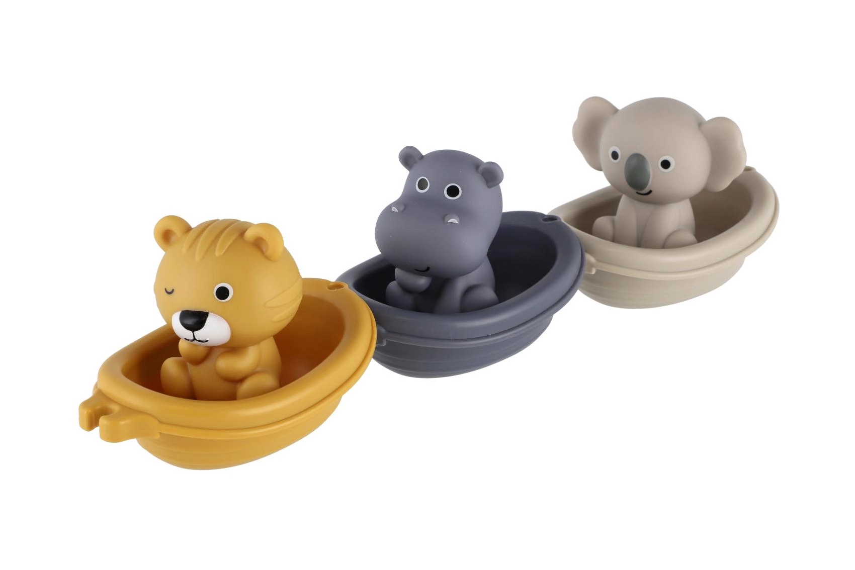 Minimalistički dizajn i umirujuća paleta boja stvaraju mirnu atmosferu, dok vesele figurice – primjerice lav, nilski konj i koala – potiču pripovjednu igru i razvoj govora. Brodice se mogu slagati jedna na drugu i lako ispirati, pa je održavanje brzo i higijensko.