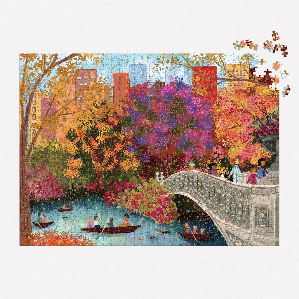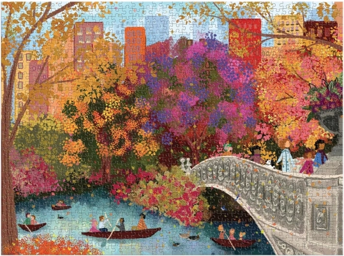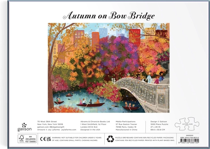 Elegantna ilustracija Joy Laforme prikazuje kultni most Bow Bridge okružen živopisnim jesenskim tonovima u srcu Central Parka. Scena puna života – šetnje preko mosta, mirna površina jezera – donosi harmoničnu i umirujuću atmosferu koja će oduševiti zaljubljenike u umjetnost i gradske pejzaže.