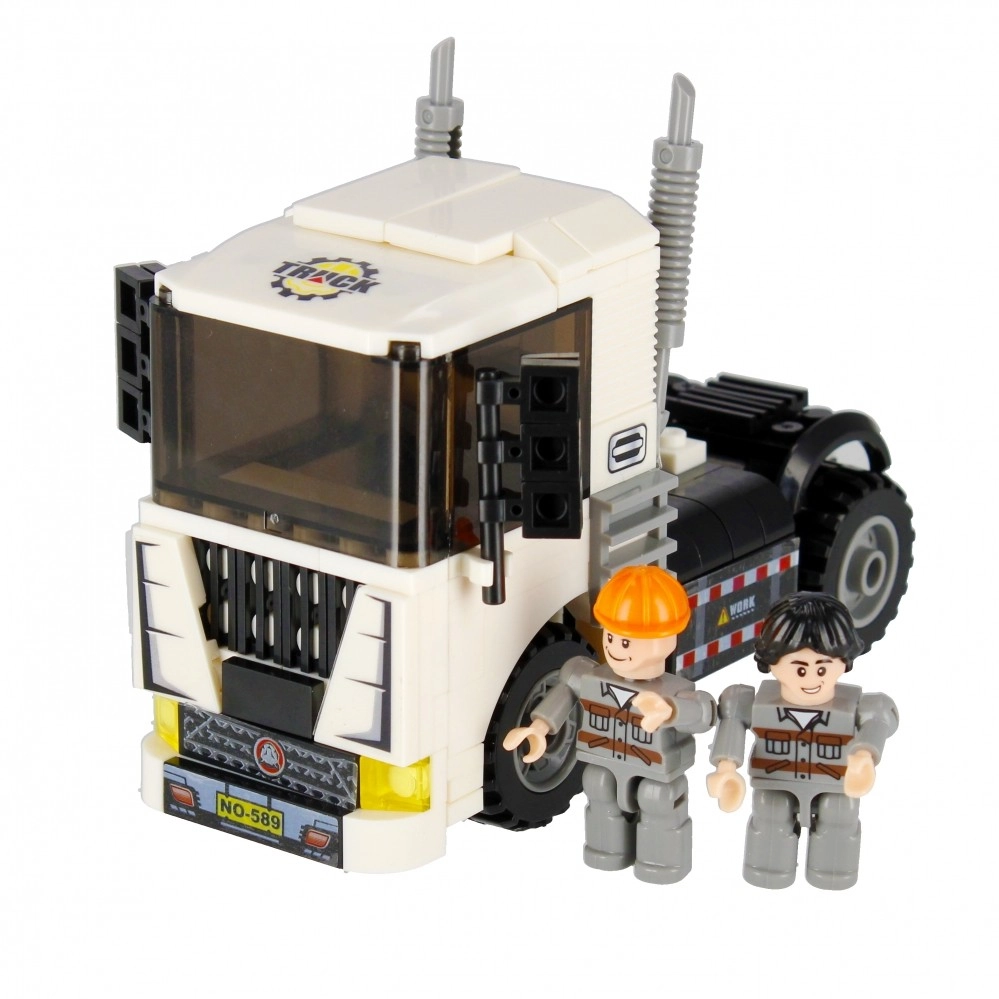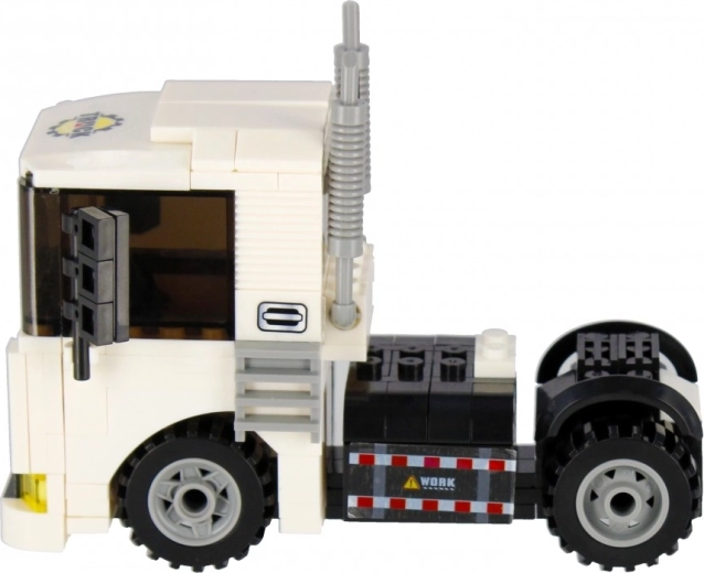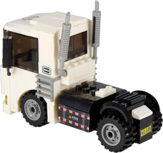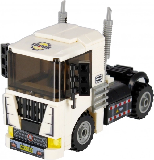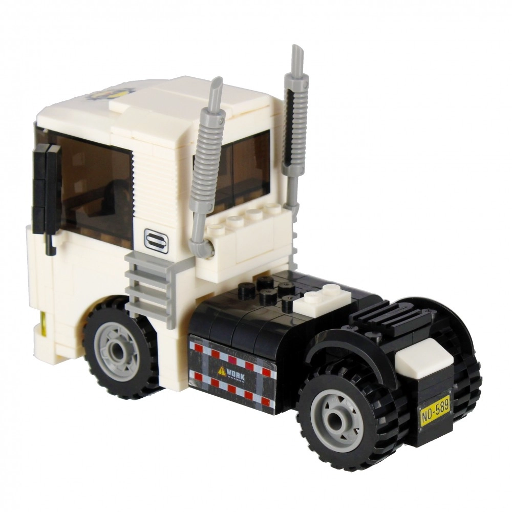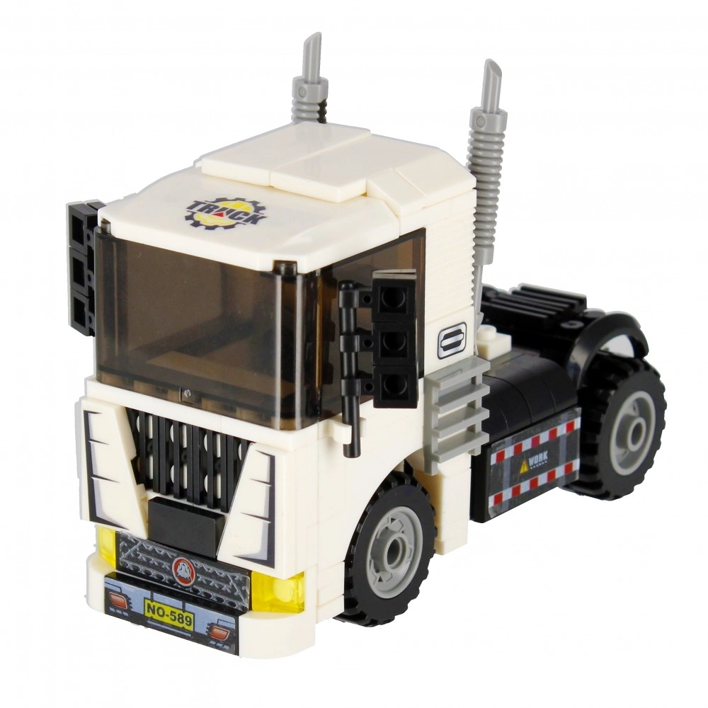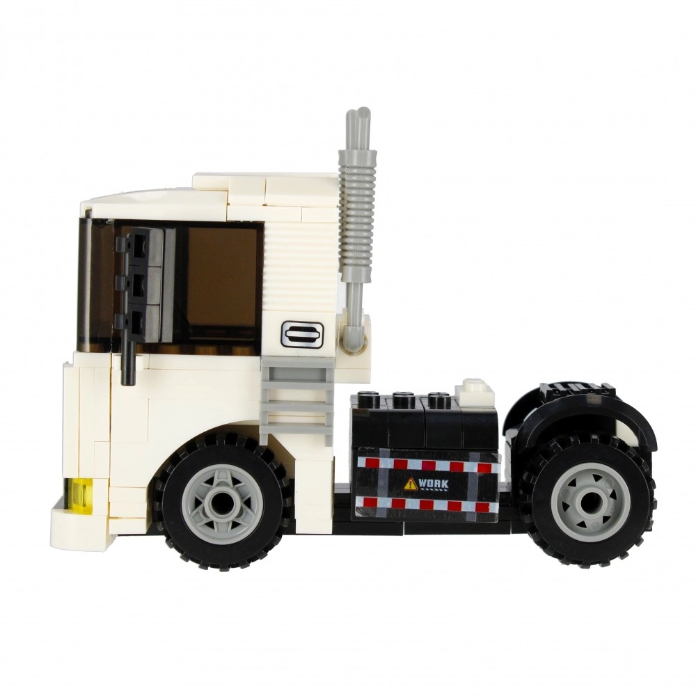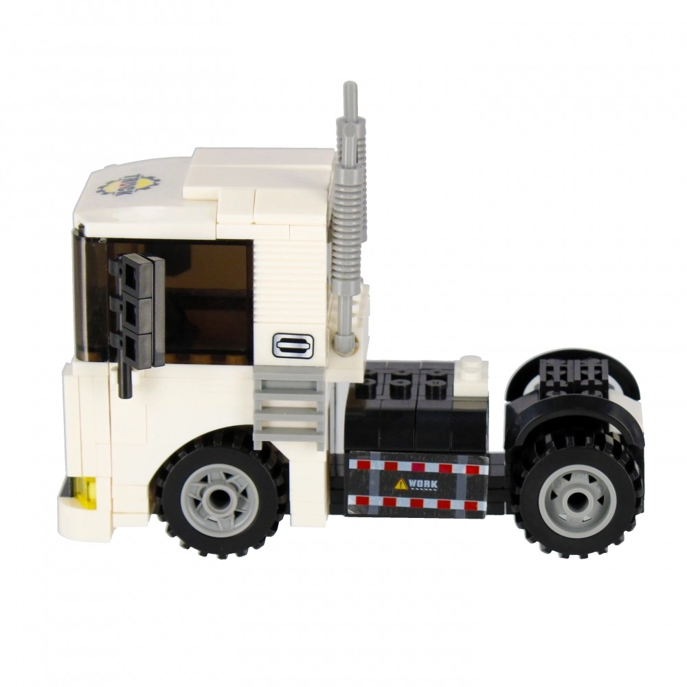 Složite bijeli tegljač s funkcionalnim kotačima, ispušnim cijevima i upadljivom kabinom. Idealan za prijevoz i građevinske scenarije u vašem gradu.