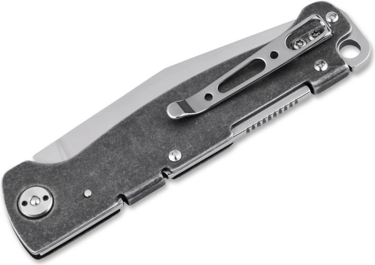 Ručno otvaranje urezom na oštrici intuitivno je i sigurno, a za sigurnost u zatvorenom i otvorenom položaju brine se robusna backlock kočnica. Cjelokupna metalna drška od nehrđajućeg čelika s tamnim stonewash završetkom otporna je na ogrebotine i djeluje elegantno. Praktična džepna kopča i otvor za vezicu proširuju mogućnosti nošenja u svakodnevnim aktivnostima.