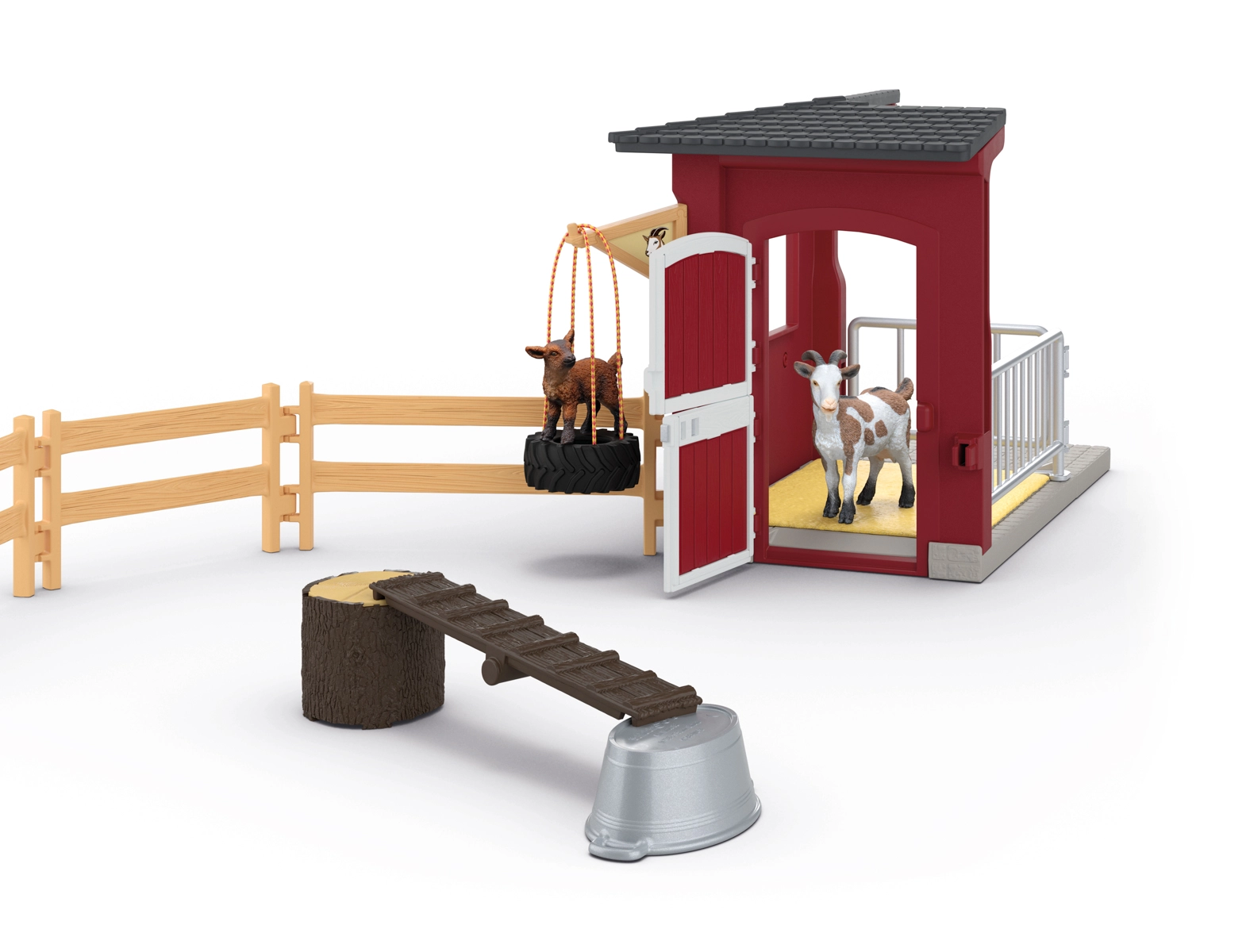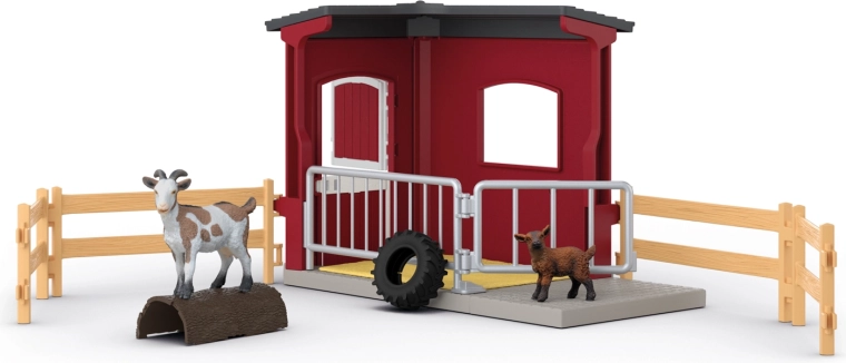 U prekrasnom crvenom toru koza i jare osjećaju se kao kod kuće. Jare se može igrati na ljuljački od gume ili penjati po rampi, dok mama gricka svježe povrće. Navečer ih čeka ugodan prostor sa slamnatom prostirkom. Realistični detalji i vrhunska izrada figurica SCHLEICH oduševit će svakog malog uzgajivača.