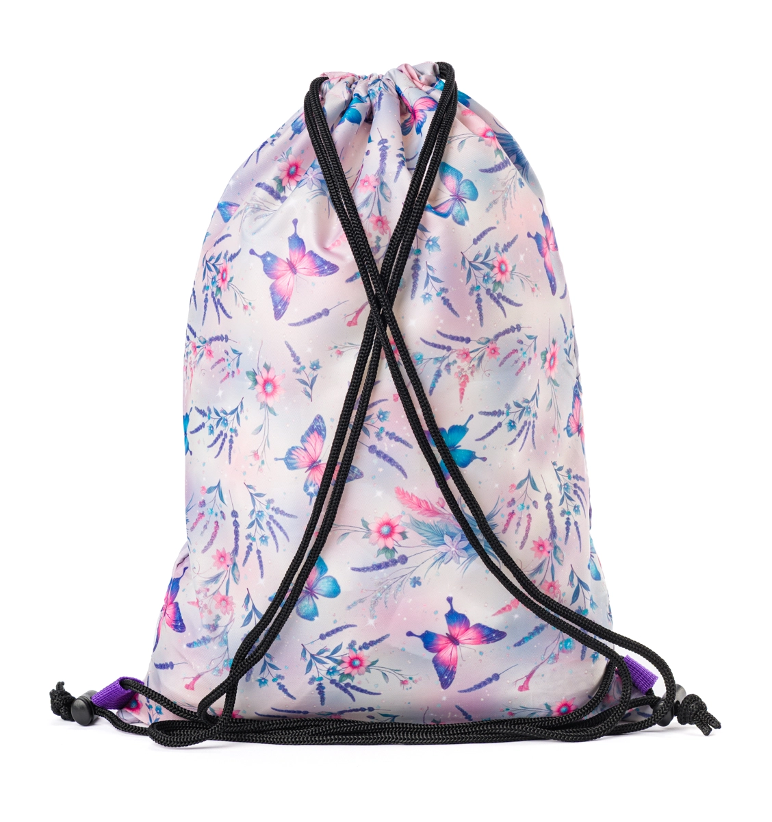 Praktična i moderna vrećica za leđa s šarenim leptirima razveselit će svako dijete u nižim razredima. Zahvaljujući laganoj konstrukciji i izdržljivom materijalu odlično je prikladna za tjelesni, likovni pribor, papuče i sitnice za aktivnosti. Sustav zatezanja ujedno služi kao naramenice pa vrećicu možete brzo otvoriti i zatvoriti jednim pokretom.