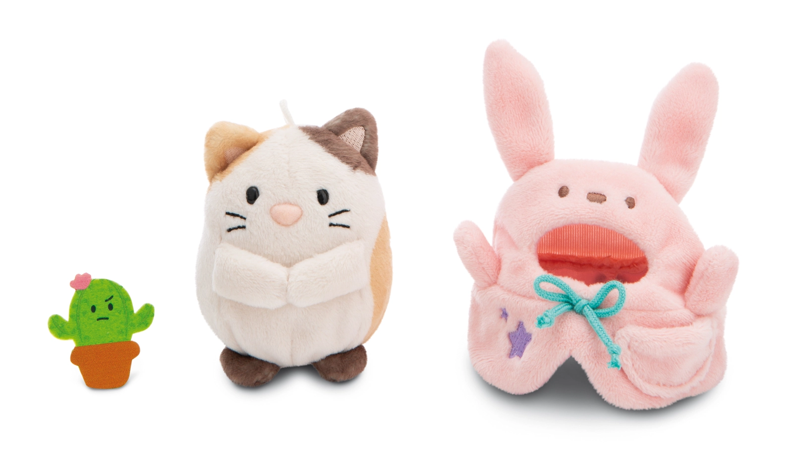 Kompletan mini set za igru i kolekcioniranje: mačkica Angy, plišani kaktus i pahuljasti ružičasti kostim sa zečjim uškama i zvjezdicama.