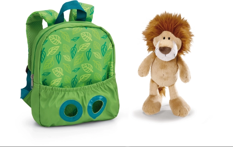 Tražite praktičan i razigrano sladak ruksak za male avanturiste? Zeleni NICI ruksak s uzorkom listova spaja funkcionalnost i zabavu – djeca mogu ponijeti svoje sitnice, a ujedno i omiljenog plišanog lava (25 cm), koji je pričvršćen u elastičnom prednjem džepu i može ih „pratiti” na svakom koraku.