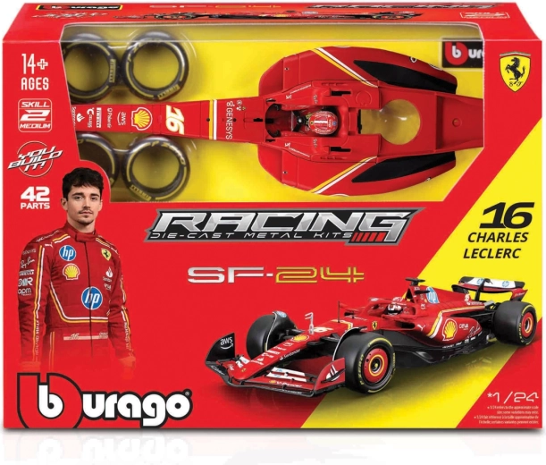 Model je izrađen od lijevanog metala (die-cast) dopunjenog kvalitetnim plastičnim dijelovima za maksimalnu autentičnost. U pakiranju ćete pronaći i vozača F1 s kacigom, koji dodatno naglašava trkaću atmosferu. Savršeno za fanove marke FERRARI, kolekcionare i strastvene modelare.