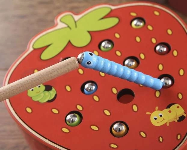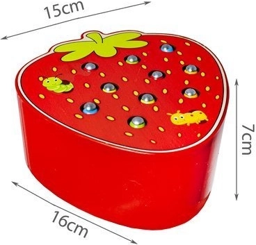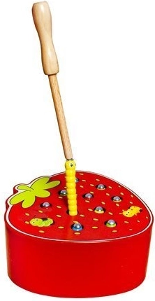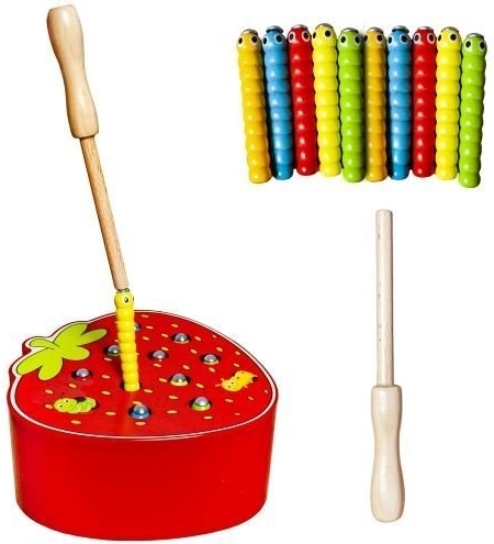 Zabavna drvena igra u obliku ukusne jagode razvija finu motoriku i koncentraciju. Djeca pomoću magnetske štapić-šipke izvlače i umeću crviće u otvore. Igra je izrađena od sigurnih materijala i ima žive boje koje potiču djecu na igru i učenje. Odličan izbor za razvoj koordinacije oko–ruka, kreativnosti i strpljenja.