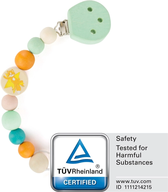 Praktičan i stilski klips za dudu od prirodnog drva drži dudu uvijek nadohvat ruke i čistom. Otporan je na slinu, izrađen od sigurnih, netoksičnih materijala, a šarene perlice i oblici potiču razvoj fine motorike od rođenja.