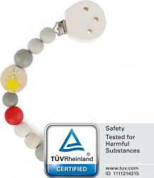 Zahvaljujući praktičnom klipu dudu lako pričvrstite na odjeću, kolica ili autosjedalicu, pa ne pada na pod i ne gubi se. Prirodne drvene perlice u nježnim bojama ugodne su dječjim rukama i očima te pomažu razvijati osjetilnu percepciju.