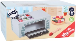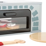 Drvena pizza peć s priborom idealna je za male kuhare koji žele doživjeti zabavu pečenja kao odrasli. Ova igračka razvija finu motoriku i potiče aktivnu igru uloga. Pizza je sastavljena od drvenih dijelova spojenih čičkom, što omogućuje jednostavnu promjenu dodataka prema dječjoj mašti.