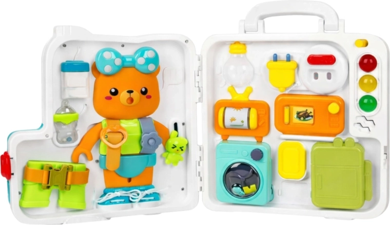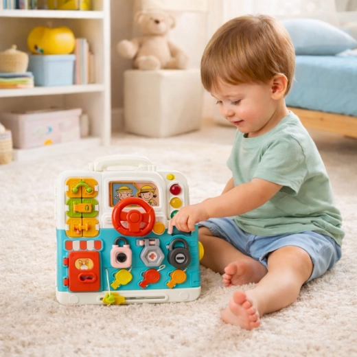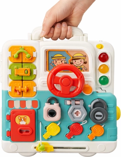 Prijenosna interaktivna ploča u obliku sklopivog kofera razvija dječju motoriku, logičko razmišljanje i osjete. Djeca se igraju s kotačićima, bravama i ključevima, prekidačima, vratima i oponašaju svakodnevne aktivnosti. Svjetlosni i zvučni efekti zadržavaju pažnju i potiču koordinaciju oko–ruka te samostalno istraživanje.
