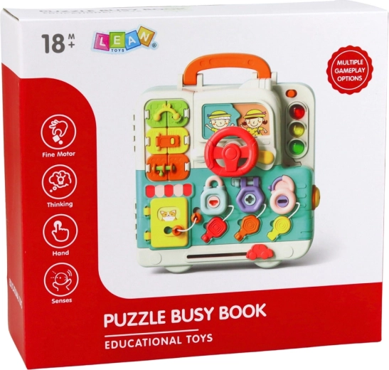Ova interaktivna ploča/knjiga dizajnirana je kao kompaktan kofer s ručkom, pa je lako možete ponijeti kući i na put. Nakon rasklapanja nudi veliku površinu za igru i pristup svim funkcijama odjednom – djeca mogu otvarati vrata, okretati volan, uključivati i isključivati prekidače, isprobavati brave s ključevima i pomicati elemente. Realistične imitacije kućanskih uređaja i svjetlosni efekti potiču maštu i usredotočenost.