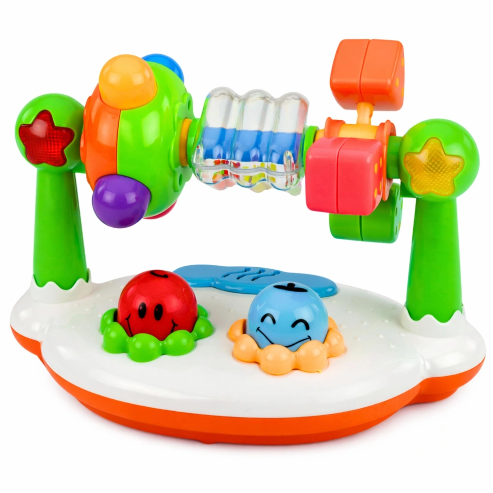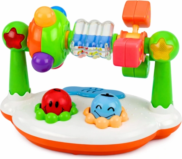 Zabavna i sigurna interaktivna igračka za najmlađe razvija finu motoriku, koordinaciju i osjetila. Pritiskom na gumb pokreću se svjetlosni efekti i melodije, dok rotirajući i klizeći elementi s perlicama pružaju multiosjetilnu stimulaciju i učenje kroz igru.