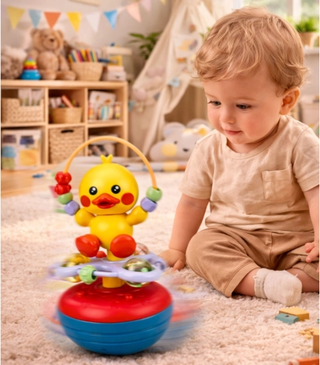 Ova interaktivna njišuška u obliku vesele žute patkice zaokuplja djecu stabilnom njihajućom bazom koja se nakon svakog potiska vraća u uspravan položaj. Djeca prirodno usvajaju uzročno-posljedične veze te vježbaju koncentraciju i koordinaciju pokreta.