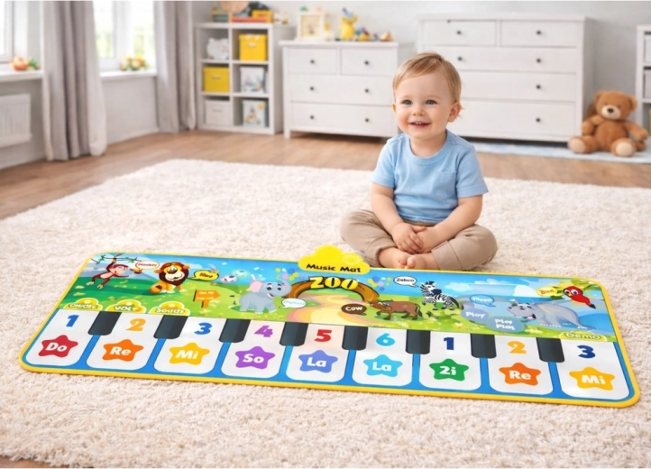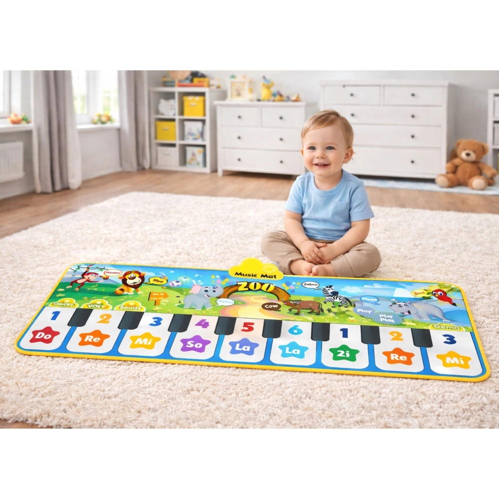 Glazbena podloga s motivom zoološkog vrta pretvara svaki korak ili dodir u ton, melodiju ili zvuk životinje. Velike, šarene tipke s oznakama Do–Re–Mi i brojevima potiču djecu na otkrivanje glazbe kroz igru, dok prijateljske ilustracije lava, zebre i nilskog konja zadržavaju njihovu pažnju.