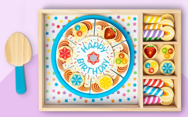 Dio seta su komadi torte, šarene svjećice i razni ukrasi koji se mogu proizvoljno mijenjati – svaka proslava izgleda drugačije, a zabava dugo traje. Igra potiče suradnju, dijeljenje te razvija finu motoriku i maštu.