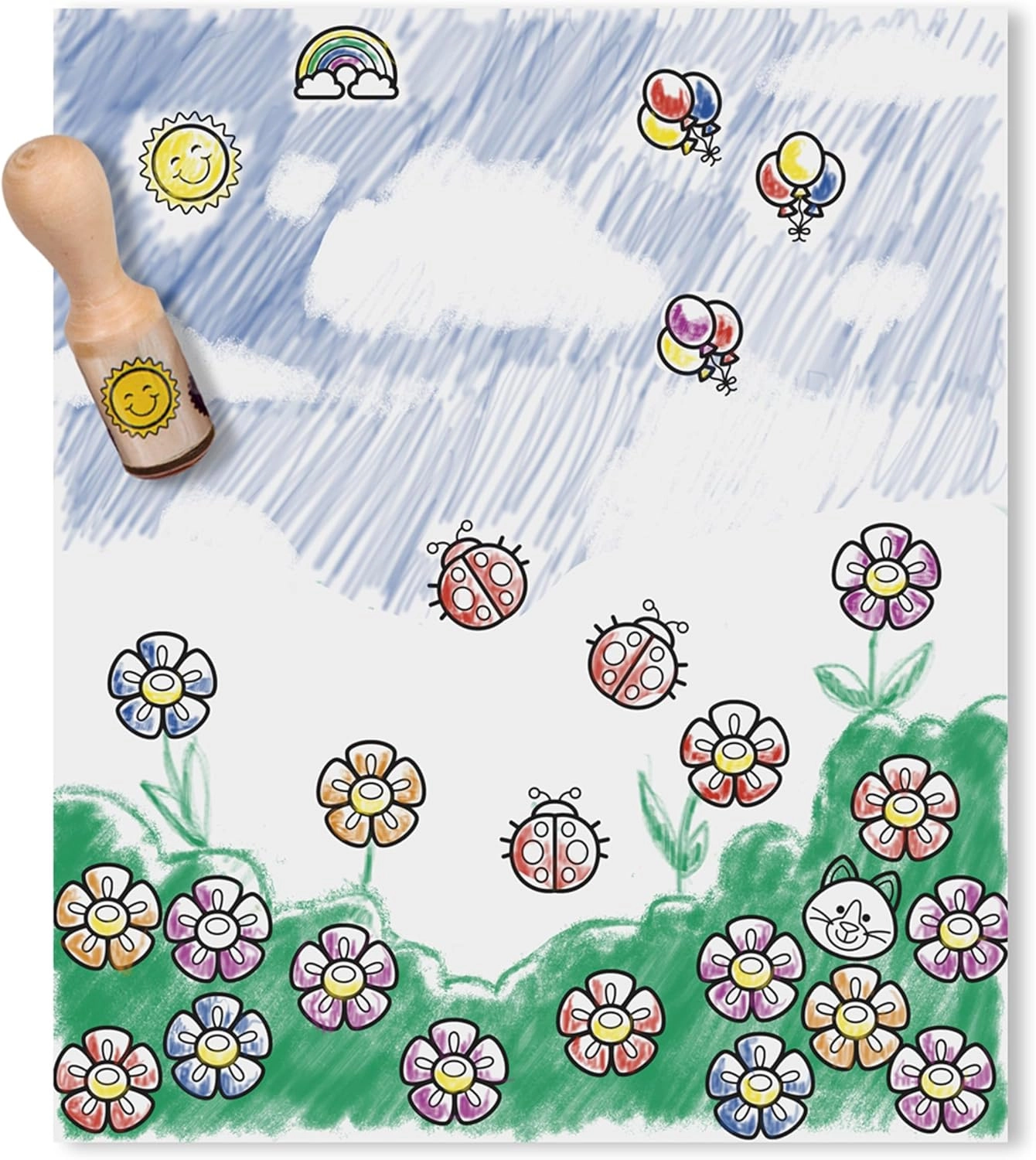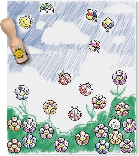 Pečati s motivima sunca, cvjetića, bubamara, duge i drugih oblika omogućuju djeci lako stvaranje veselih crteža i dekoracija.