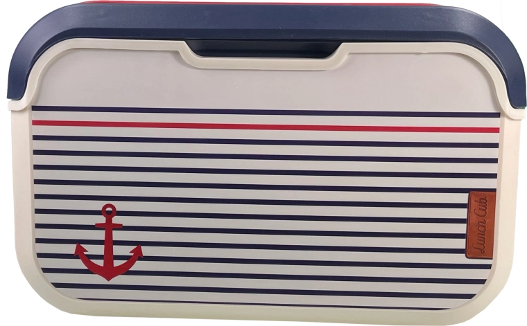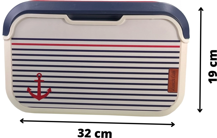Proizvedeno u Europi (Francuska) prema europskim normama za kontakt s hranom. Kućište od kvalitetnog polipropilena je lagano, izdržljivo i lako se pere – dovoljna je vlažna spužvica i kap deterdženta za posuđe. Stilski mornarički uzorak sa sidrom, vanilijsko tijelo i plavi poklopac upotpunjuje crvena ručka za udobno nošenje.