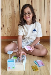 U paketu su igraće novčanice i drvena kreditna kartica – idealno za vježbanje osnovnih računa, cijena i platnih situacija.