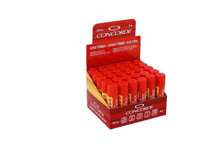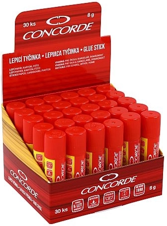 Praktično i pouzdano ljepilo u stiku CONCORDE mase 8 g za svakodnevnu upotrebu u uredu, školi i kod kuće. Brzo i čisto lijepljenje papira, kartona, tkanina i fotografija, ne isušuje se, sigurno je za djecu i lako se ispire. Provjerena kvaliteta – testirano, lijepi do 5 godina.