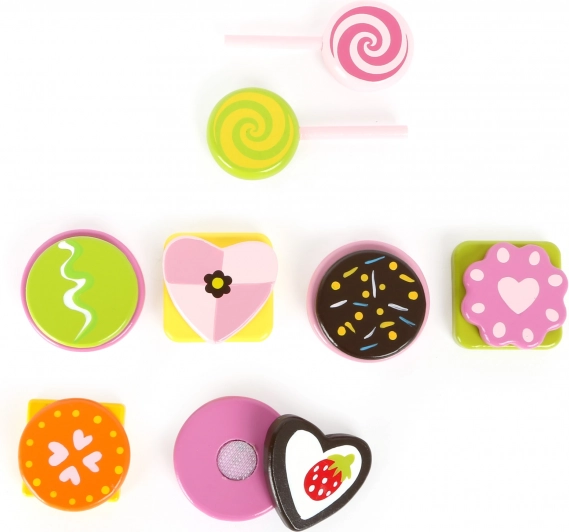Otkrijte čaroliju slatke igre s raznobojnim setom drvenih poslastica SMALL FOOT. Lizalice, keksi i praline izrađeni su od 100% certificiranog FSC drva te ih djeca zahvaljujući čvrstim čičak-trakama mogu neprestano razdvajati i spajati. Realistični dodaci pretvaraju svaku dječju kuhinju u kreativnu slastičarnicu.