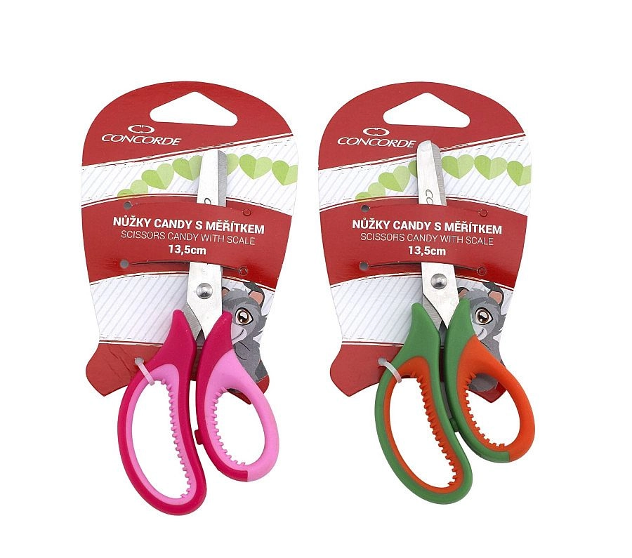 Školske škare CONCORDE Candy dužine 13,5 cm idealne su za djecu i kućnu upotrebu. Nude integriranu mjernu skalu, udoban široki prihvat i šareni otisak u ružičastoj ili zelenoj varijanti. Isporučuju se na blistru za jednostavno i sigurno skladištenje.