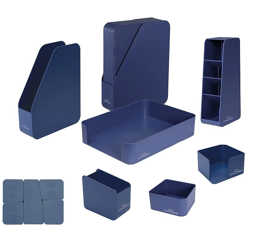 Organizirajte svoj radni stol elegantnim setom CONCORDE Eco od 7 dijelova u plavoj boji, izrađenim od recikliranih materijala. Set nudi cjelovitu organizaciju dokumenata i pisaćeg pribora, minimalizam s nagrađenim dizajnom Red Dot Award 2022 i odgovoran odabir zahvaljujući GRS certificiranom podrijetlu reciklata.