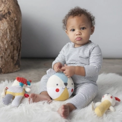 Mekana tekstilna zvečka u obliku medvjedića donosi bebama nježne zvučne poticaje i sigurnost ugodnog držanja. Zahvaljujući organskim materijalima prikladna je i za osjetljivu kožu te podupire razvoj fine motorike i senzorne percepcije.