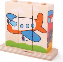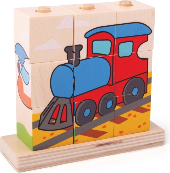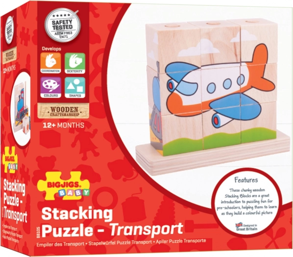 Drveni puzzle Bigjigs Baby Prijevozna sredstva je idealna igračka za razvoj motorike i koordinacije ruku i očiju kod djece. Sadrži 10 komada drvenih blokova s četiri scene prijevoza: vlak, auto, traktor i avion.