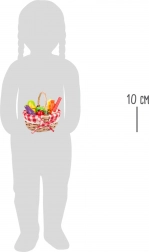 Ovaj kvalitetan set sadrži pletenu košaricu s kariranom tkaninom te drvene komade voća i povrća (jagode, mrkva, patlidžan, kukuruzni klip, jabuka, banana itd.). Dijelovi su spojeni čičak-trakom, pa ih djeca mogu sigurno “rezati” drvenim nožem i ponovno spajati. Savršen dodatak za dječju kuhinju i prodajni štand.