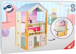 Ova elegantna kućica za lutke s okretnom bazom pretvara svaku igru u čarobnu priču. Zahvaljujući rotacijskom disku cijela je kuća lako dostupna sa svih strana, pa se s njom mogu istodobno igrati i braća i sestre. Nudi tri kata, bogatu opremu uključujući 15 komada drvenog namještaja, klizna vrata i dekorativno otisnute zidove. Prikladno za lutke do 12 cm, izrađeno od kvalitetnog drva za dugotrajnu i sigurnu igru.
