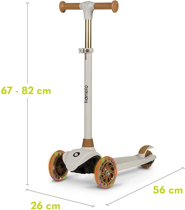 LIONELO Jessy idealan je romobil za djecu koja uče voziti i razvijaju ravnotežu. Stabilna troskotačna konstrukcija s dva prednja kotača pomaže graditi sigurnost, dok niska i široka daska s protukliznom površinom omogućuje sigurno penjanje i silazak. Zahvaljujući LED kotačima koji svijetle tijekom vožnje, dijete je vidljivije, a vožnja još zabavnija.