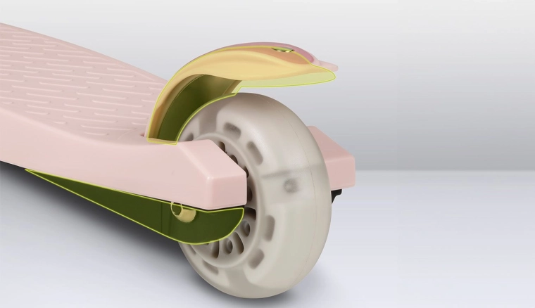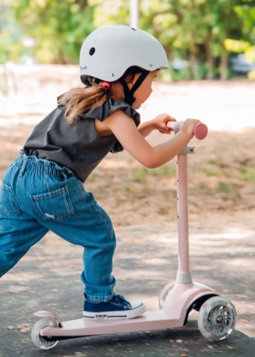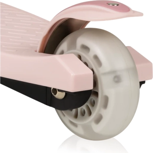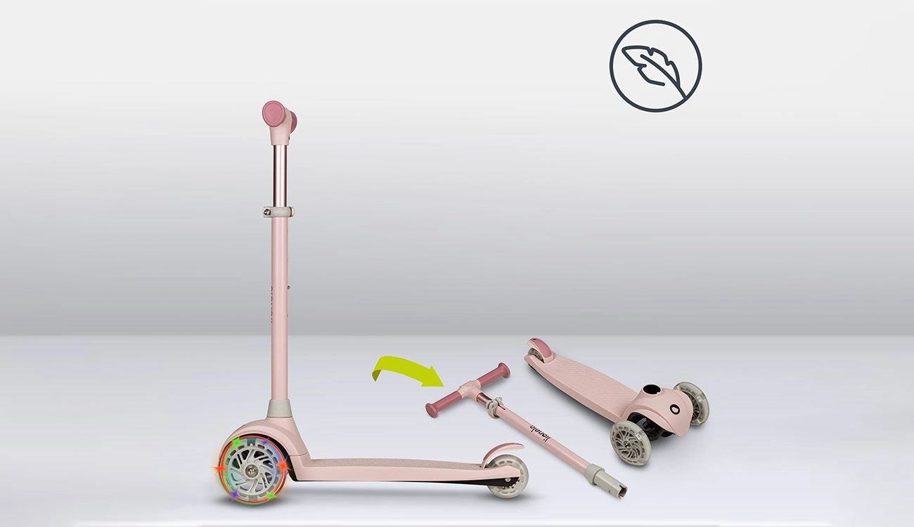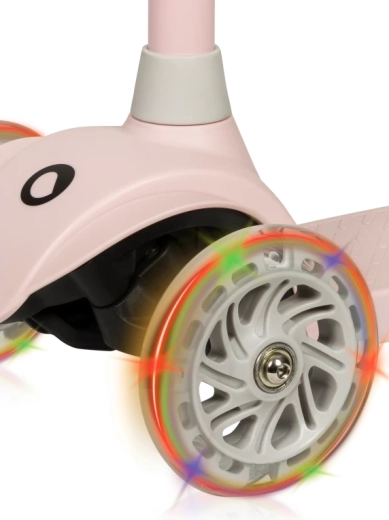 Podesiva visina upravljača u četiri koraka raste s vašim djetetom, ležajevi ABEC-7 brinu za glatku vožnju, a LED svjetla u kotačima svijetle pri kretanju – bez baterija. Ograničivač kuta upravljanja od 65° podupire sigurnije držanje putanje i učenje pravilnog nagiba pri skretanju.