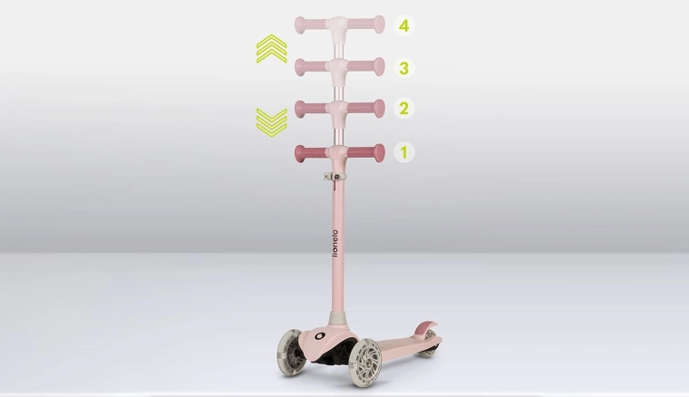 Jednostavno podesite visinu T-bar upravljača u četiri koraka (otprilike 65–80 cm), pa romobil traje dulje i prilagođava se stasu djeteta.