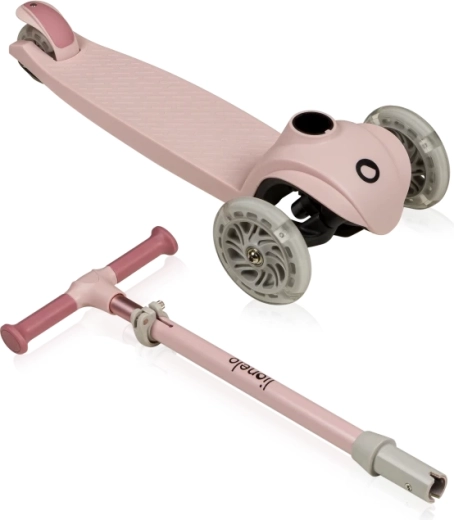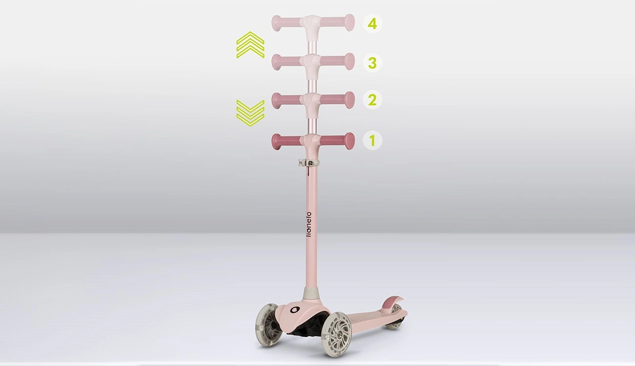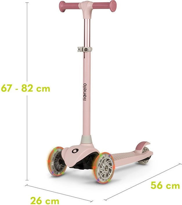 Lagan i stabilan dječinski troskotačni romobil LIONELO Jessy Pink Rose potiče ravnotežu i motoriku djece. Nudi 4-stupanjsko podešavanje visine upravljača, protukliznu platformu, stražnju nožnu kočnicu i svjetleće LED kotačiće s ležajevima ABEC-7 za glatku vožnju. Maksimalna nosivost 50 kg i ograničenje kuta upravljanja 65° za sigurnije upravljanje.