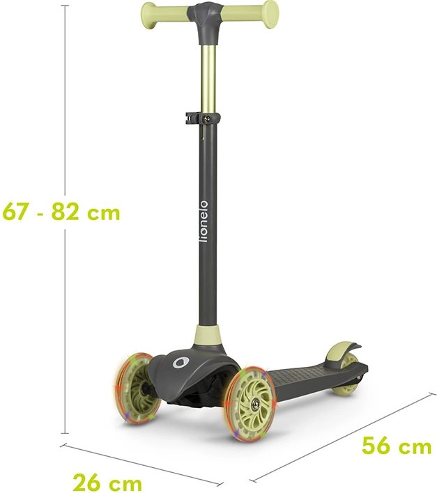Lagan i stabilan dječji romobil LIONELO Jessy s tri kotača nudi sigurno učenje vožnje i ravnoteže. Zahvaljujući LED kotačićima, upravljaču podesivom u 4 stupnja i protukliznoj platformi idealan je za djecu koja rastu. Tu su i stražnja nožna kočnica, kvalitetni ABEC-7 ležajevi te ograničivač upravljanja 65° za bolju kontrolu. Nosivost do 50 kg.