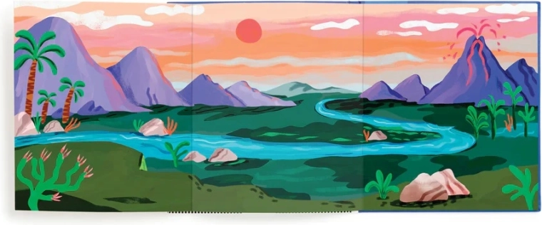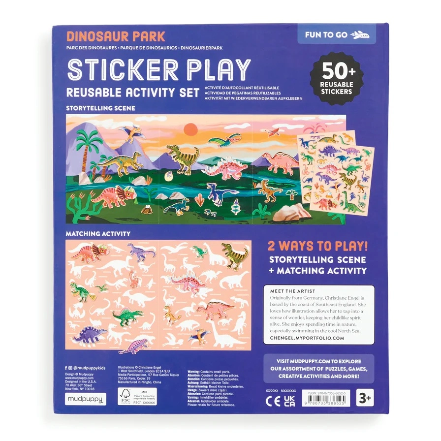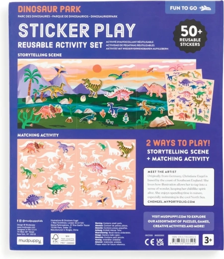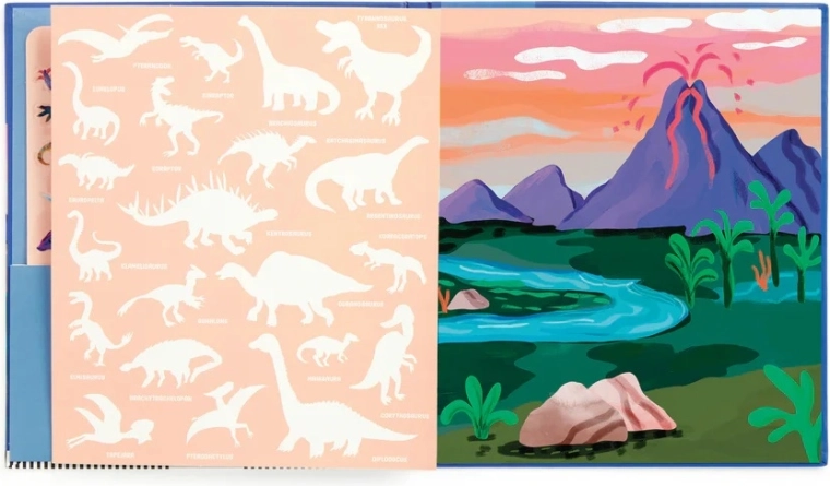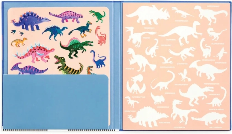 Otkrijte šareni prapovijesni svijet u kojem oživljavaju T‑Rex, Triceratops i drugi dinosaurovi prijatelji. Djeca mogu naljepnice slobodno lijepiti, premještati i ponovno koristiti – scene tako nastaju i mijenjaju se u trenu. Sklopiva pozadina nudi prostranu površinu za igru i pričanje.