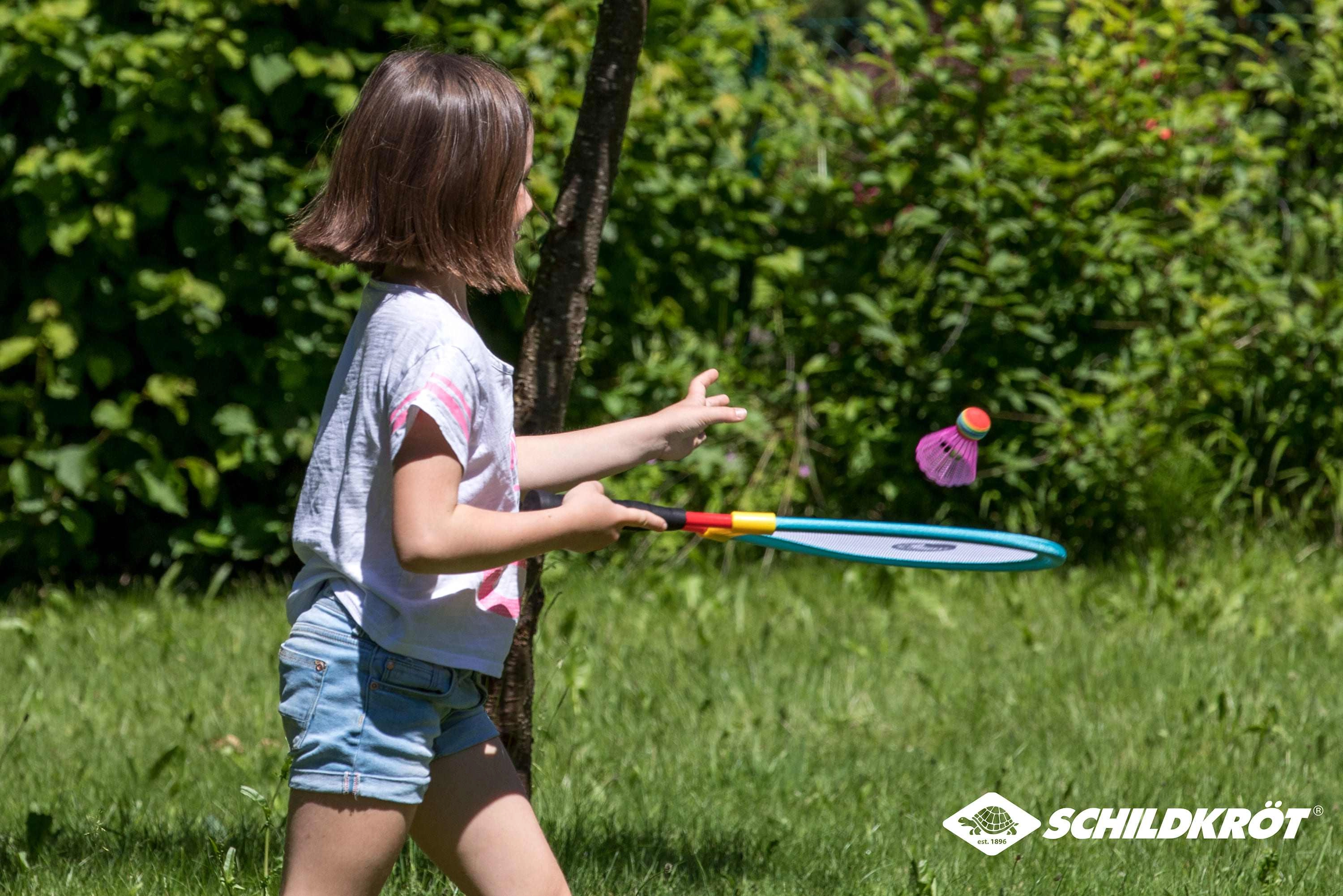 Univerzalni set marke SCHILDKRÖT spaja omiljene reketne sportove – tenis i badminton – u jednu zabavnu igru za cijelu obitelj. Zahvaljujući okviru s elastičnom mrežom za udarac je potrebno manje snage, pa je savršen za djecu i početnike. U pakiranju se nalazi 2 velika reketa (62,5 cm), mekana loptica i šareni badminton loptić za igru na otvorenom i u zatvorenom.