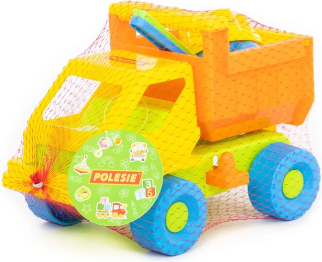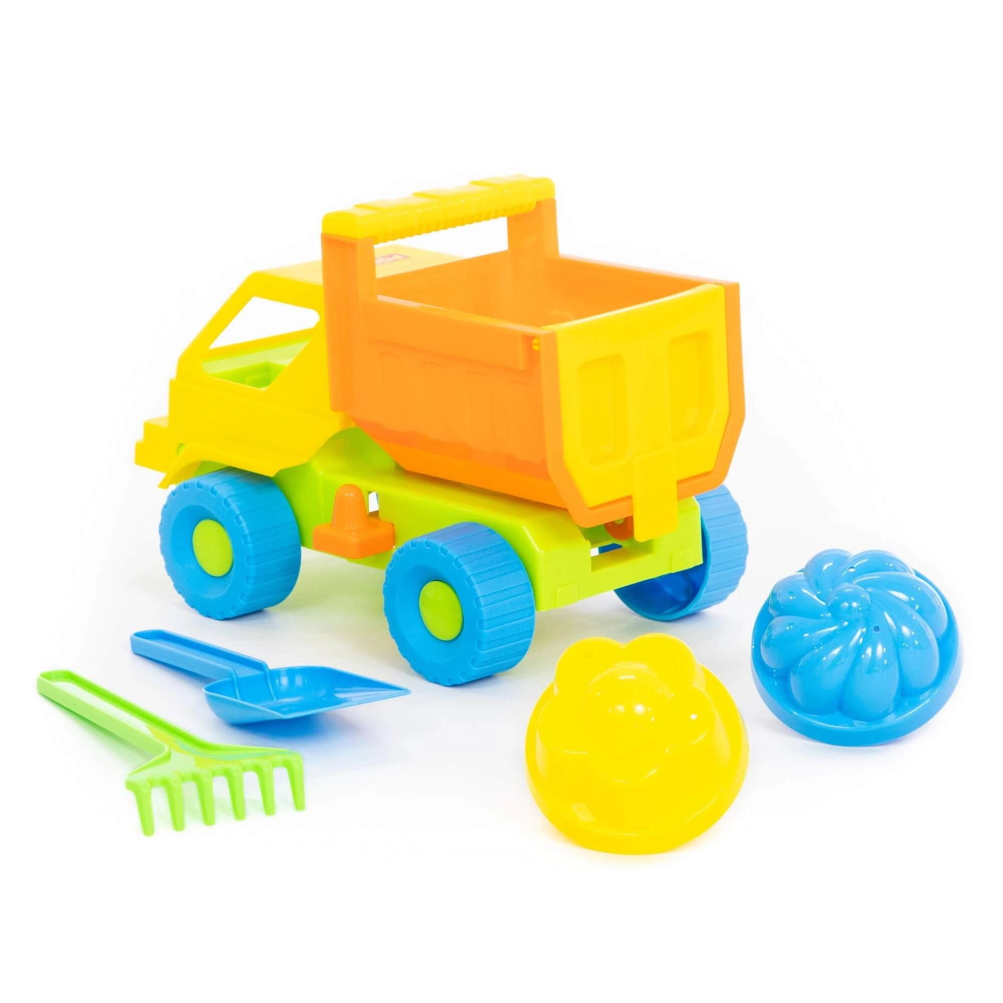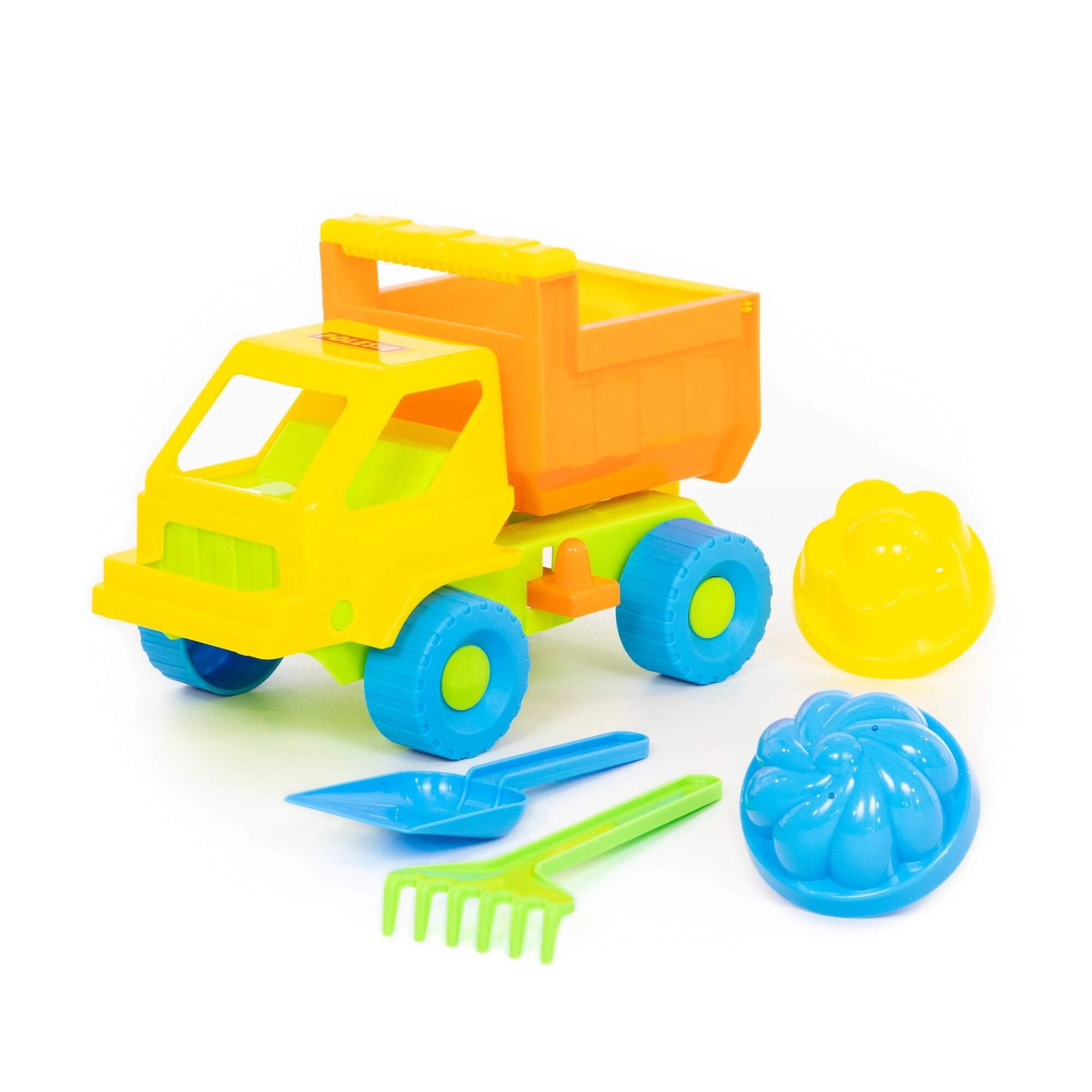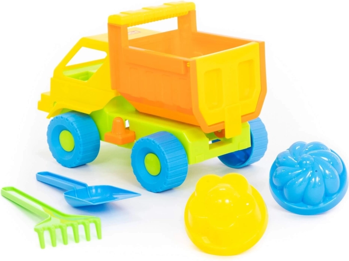 - Kompletna oprema: autić s kiperskom karoserijom, 2 kalupića, lopatica i grabljice.