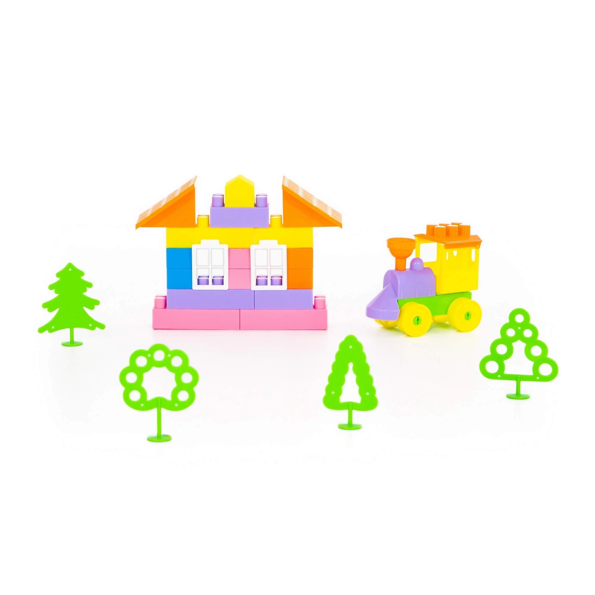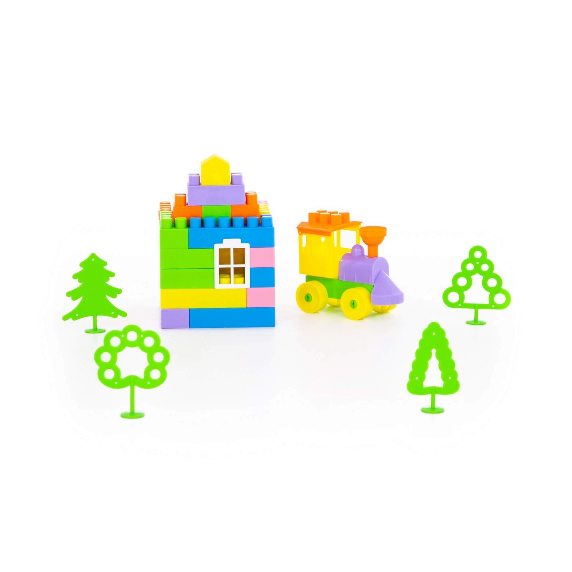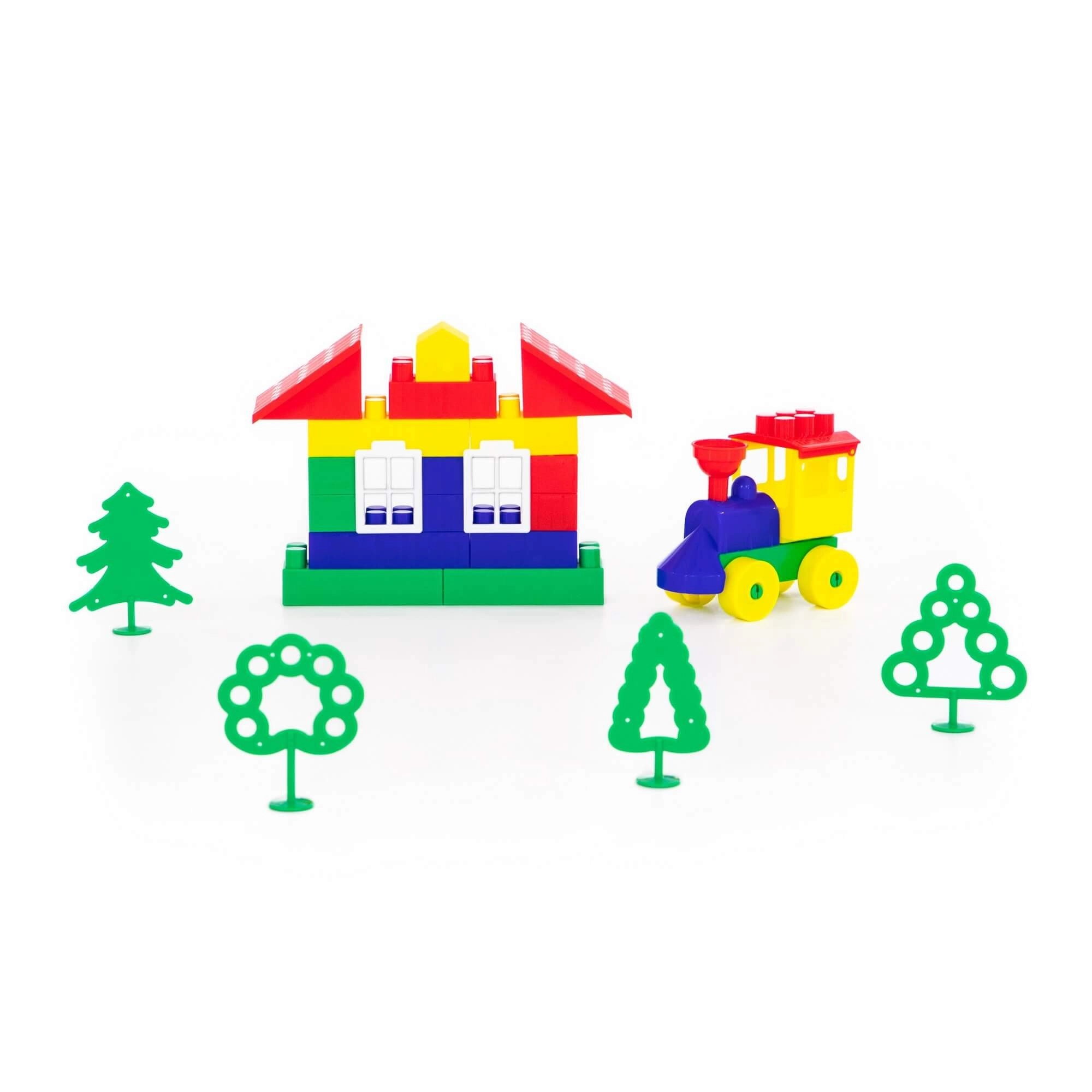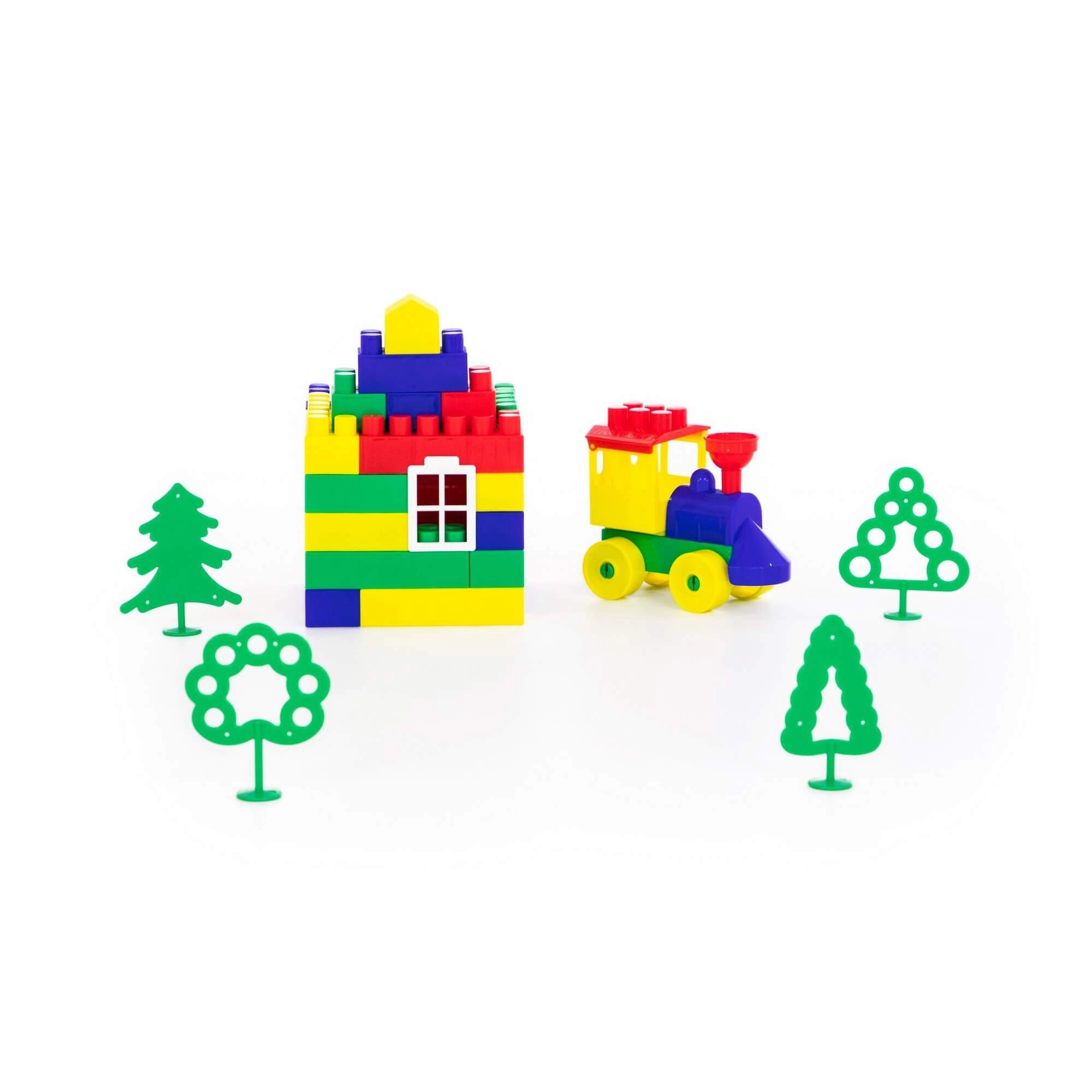 Set uključuje dijelove za jednostavan vlakić, kućicu i drveće – djeca tako lako stvaraju vlastite priče i prizore.