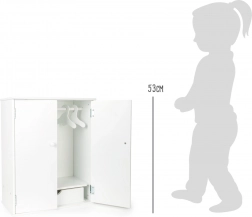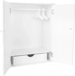 Ovaj bijeli ormar za lutke idealan je za održavanje reda u garderobi vaših omiljenih lutaka. Praktičnim dizajnom omogućuje lako vješanje odjeće i organizaciju malih predmeta, što je savršeno za dječje igre.