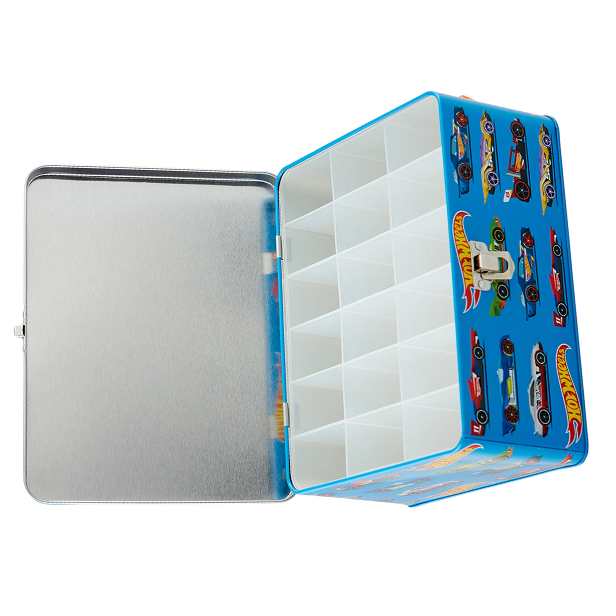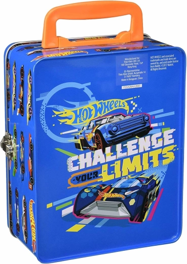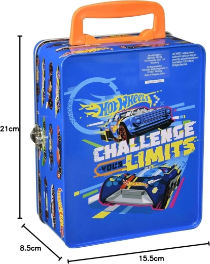 Ovaj stilski plavi kofer s grafikom trkaćih auta i sloganom „Challenge Your Limits” izvrsno je rješenje za sve male kolekcionare. Unutra se nalazi izvadiva mrežica s 18 zasebnih pretinaca koja drži autiće pregledno odvojene i zaštićene. Robusna metalna konstrukcija i pouzdano kopčasto zatvaranje osiguravaju sigurno spremanje pri prenošenju.