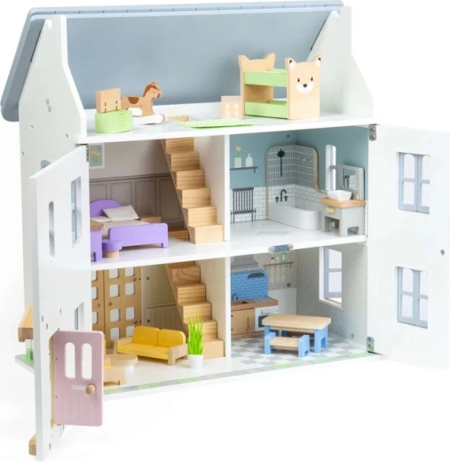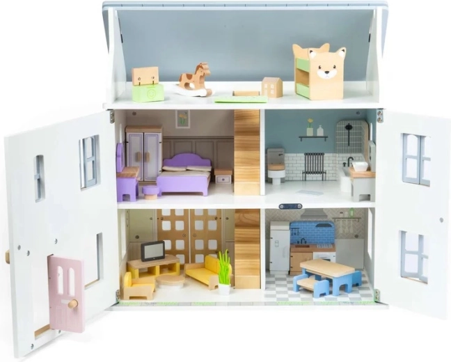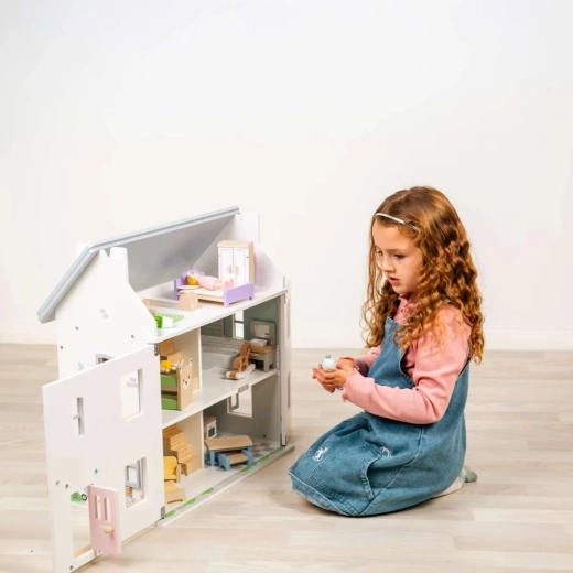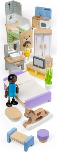 Ovaj svestrani set nudi sve potrebno za opremanje kućice za lutke – od sofe i stolića, preko kuhinjskih i kupaonskih elemenata, do kreveta, ormara i dodataka za dječju sobu. Zahvaljujući pomnoj izradi i ugodnim pastelnim bojama, namještaj djeluje prirodno i poziva na igru.
