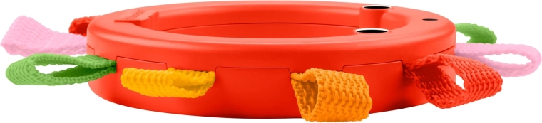 Kompaktan plastični prsten s višebojnim tekstilnim petljama odlično leži u dječjoj ruci i potiče prve pokušaje hvatanja i prebacivanja iz ruke u ruku.