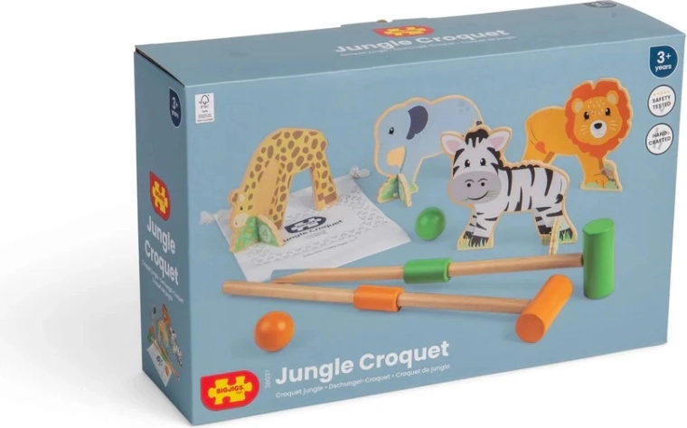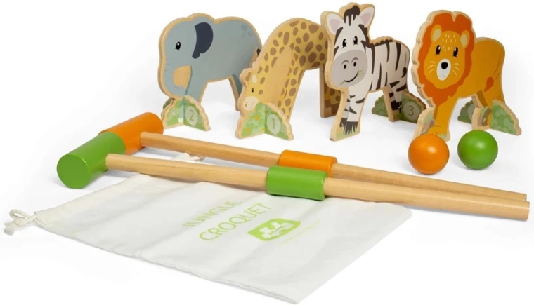 Dječji kroket Džungla donosi bezvremensku zabavu u modernom izdanju. Četiri vesela životinjska luka (lav, nilski konj, slon, žirafa), dvije šarene loptice i dvije čvrste palice čine savršen set za igru u domu i na otvorenom. Palice se mogu odviti na dva dijela, a sve se lako sprema u priloženu pamučnu vrećicu – idealno za putovanja i brz posprem.