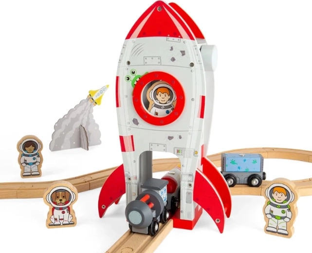 Drvena svemirska raketa BIGJIGS RAIL stilski je tunel za željezničke pruge za vlakove, uz koji će vaša djeca doživjeti beskrajne svemirske avanture. Jednostavno je uklopite u postojeću mrežu tračnica i u trenu stvorite vlastitu međuzvjezdanu rutu. U paketu je figura astronauta i dizalo koje ga podiže u startni položaj.